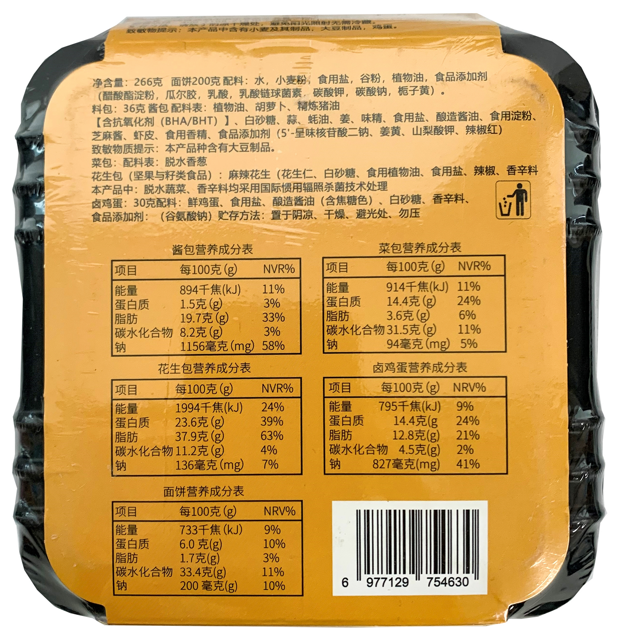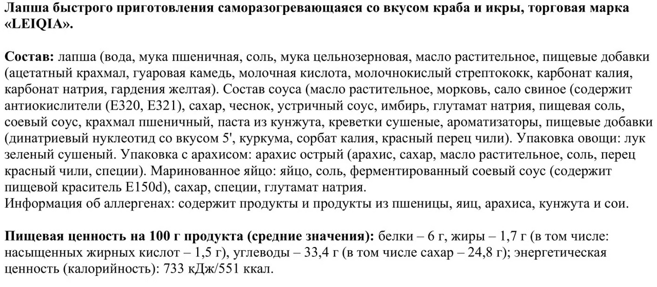Лапша (вода, мука пшеничная, соль, мука цельнозерновая, масло растительное, пищевые добавки (ацетатный крахмал, гуаровая камедь, молочная кислота, молочнокислый стрептококк, карбонат калия, карбонат калия, гардения желтая); соус (масло растительное, морковь, сало свиное (содержит антиокислители (Е320, Е321), сахар, чеснок, устричный соус, имбирь, глутамат натрия, пищевая соль, соевый соус, крахмал пшеничный, паста из кунжута, креветки сушеные, ароматизаторы, пищевые добавки (динатриевый нуклеотид со вкусом 5’, куркума, сорбат калия, красный перец чили); овощи (лук зеленый сушеный); арахис острый (арахис, сахар, масло растительное, соль, перец красный чили, специи); маринованное яйцо (яйцо, соль, ферментированный соевый соус (содержит краситель Е150d), сахар, специи, глутамат натрия).