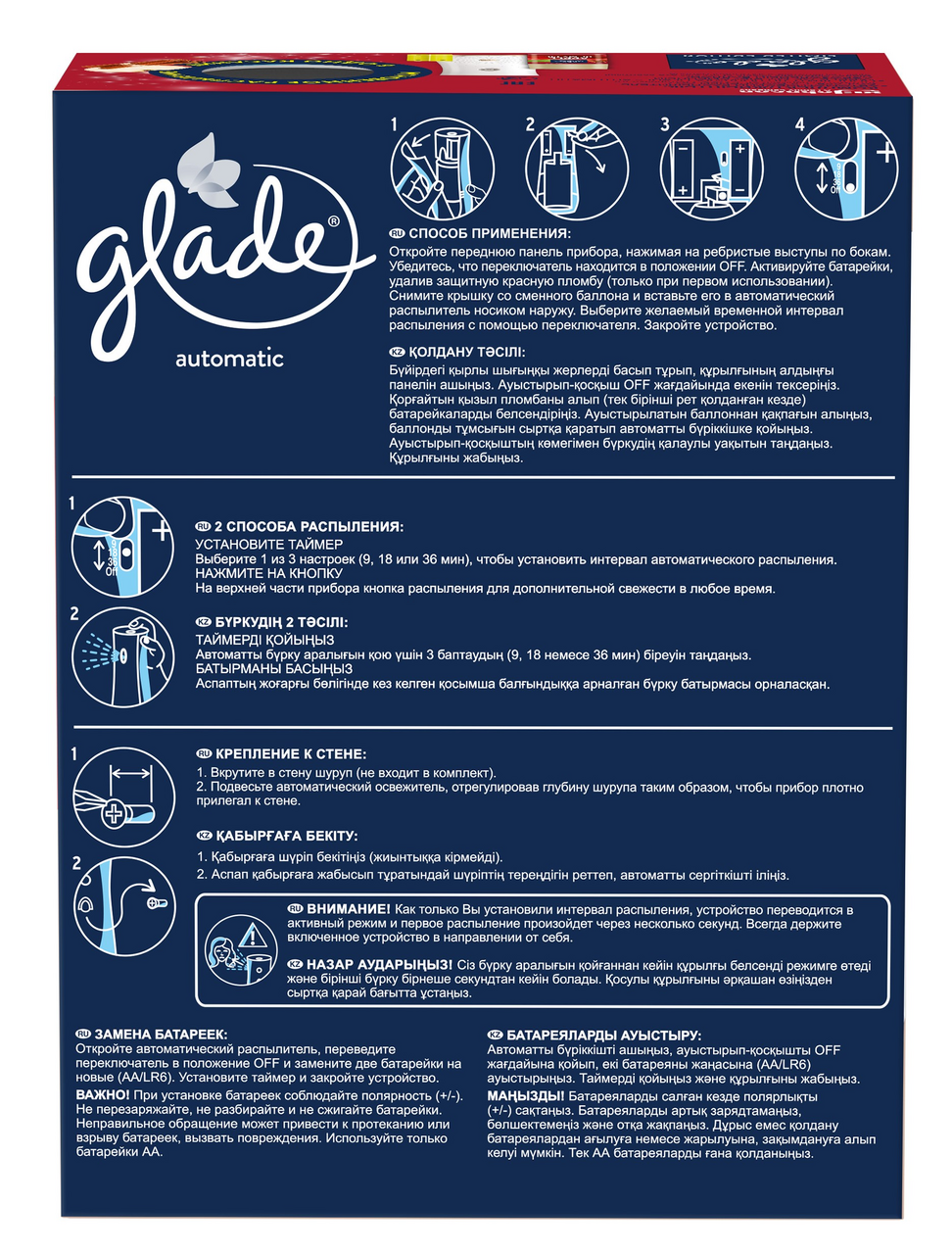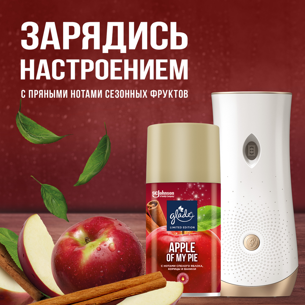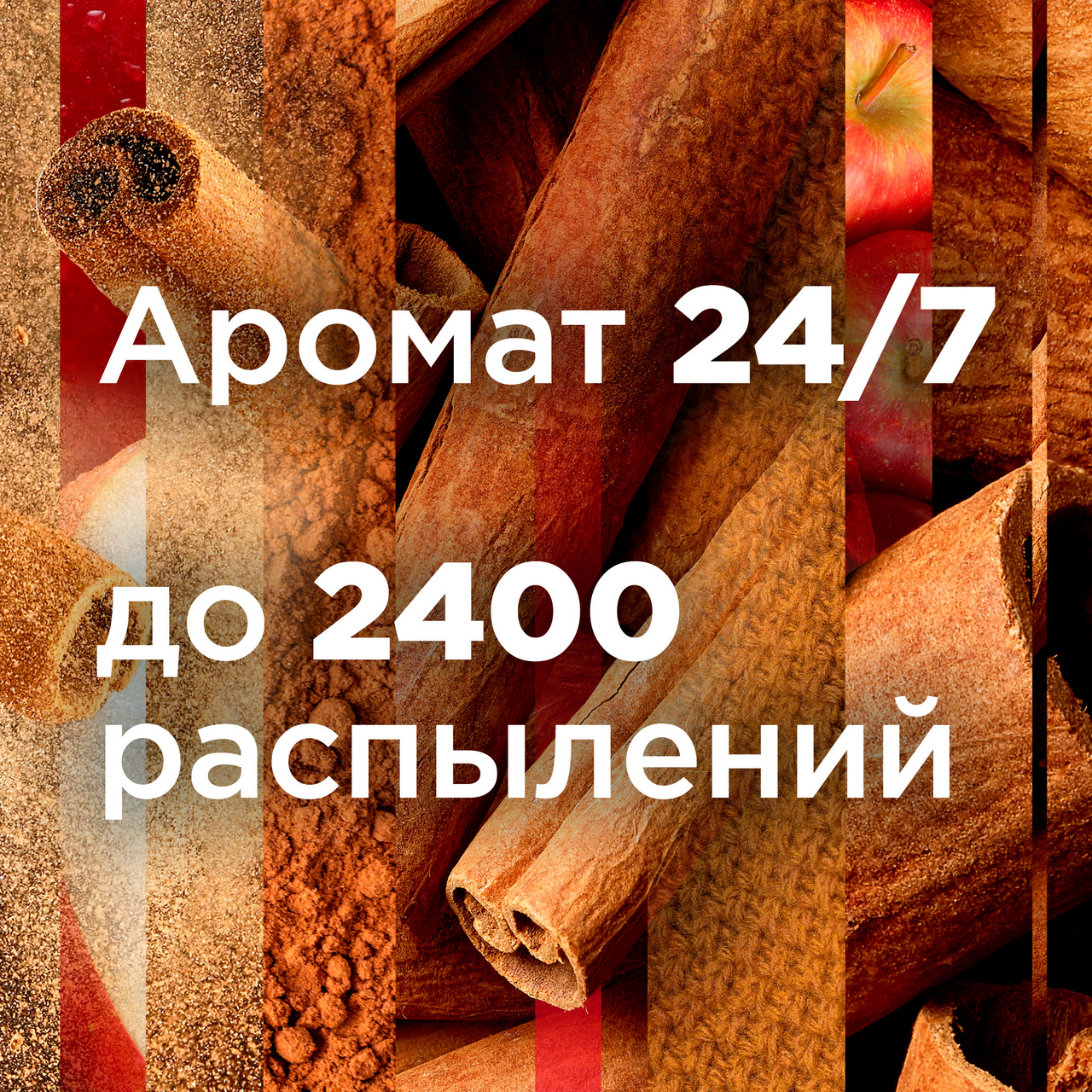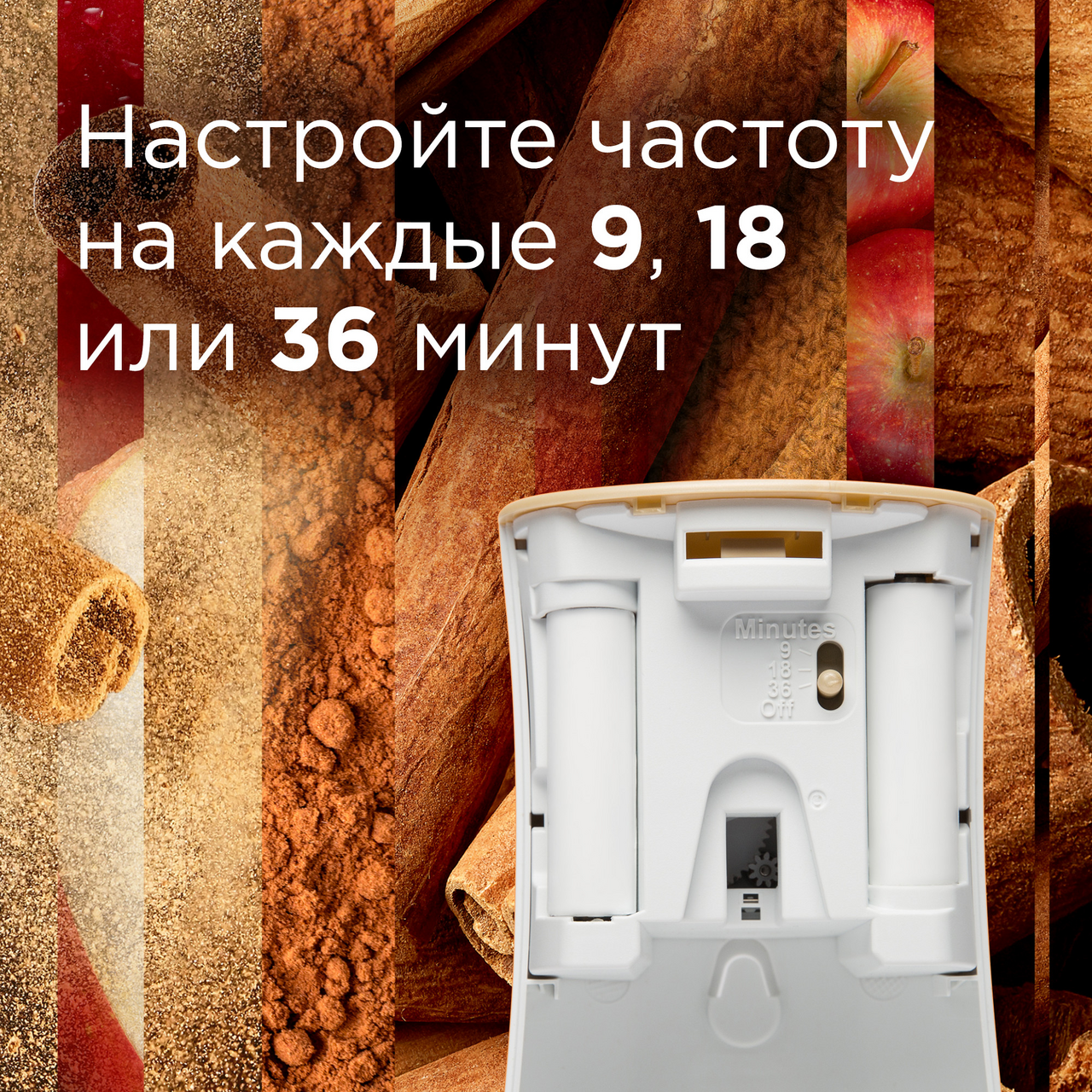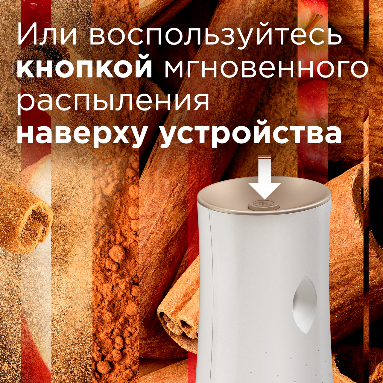 Limited Edition - ограниченная серия. Наполните дом теплом! Насыщенный аромат спелых яблок, щедро приправленных пряной корицей, очарует вас и подарит ощущение уюта. Способ применения: Откройте переднюю панель прибора, нажимая на ребристые выступы по бокам. Убедитесь что переключатель находится в положении OFF. Активируйте батарейки, удалив защитную красную пломбу (только при первом использовании). Снимите крышку со сменного баллона и вставьте со в автоматический распылитель носиком наружу, выберите желаемый временной интервал распыления с помощью переключателя. Закройте устройство.