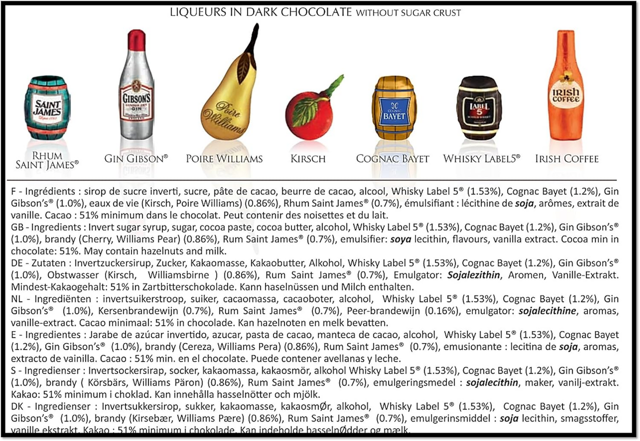 Инвертный сахарный сироп (инвертированный сахар, вода), сахар, какао тертое, масло какао, спирт этиловый, виски Label 5 (вода, выдержанные зерновые дистилляты на основе ячменного солода и пшеницы, дистиллят из сахарного тростника, сок концентрированный из свеклы), коньяк Bayet (коньячный дистиллят, вода, сахарный сироп, краситель (Е150а)), джин Gibson’s (вода, спирт этиловый, дистиллят из ягод можжевельника), ром Saint James (вода, дистиллят из сахарного тростника, сок концентрированный из свеклы), бренди KIRSCH (дистиллят из вишни, вода), эмульгатор (лецитин соевый), бренди Williams (дистиллят из груш, вода), ароматизаторы, натуральный ароматизатор ванили.