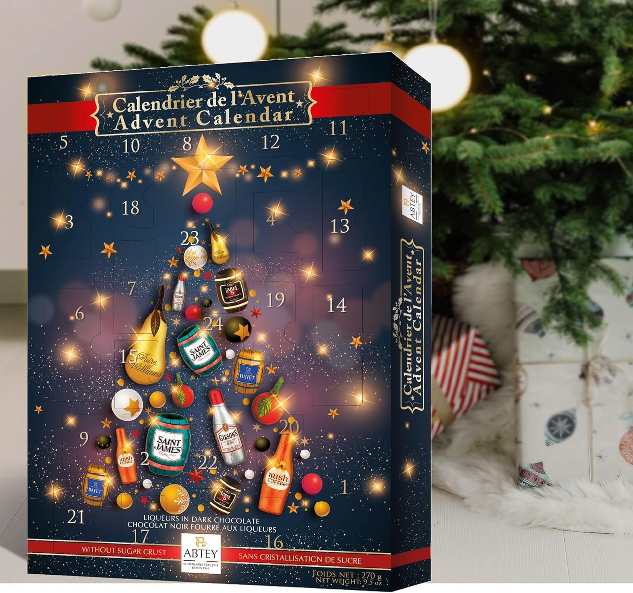 Набор конфет ассорти из темного шоколада с алкогольными начинками Advent calendar Christmas Magic. В этом календаре от Abtey Chocolatiers представлены 24 шоколада с ликерной начинкой, в том числе Куантро, Пуаре Уильямс, кальвадос и Сент-Джеймс.