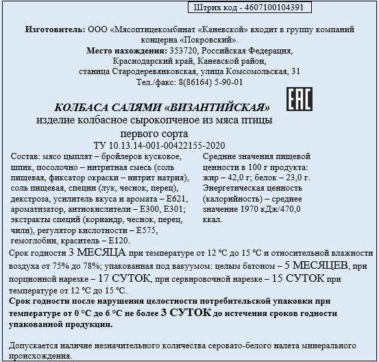 Колбаса Каневской салями византийская сырокопченая, ~270г