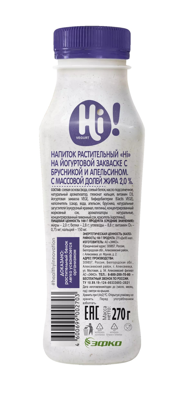 Напиток растительный Hi брусника и апельсин 2%, 270г