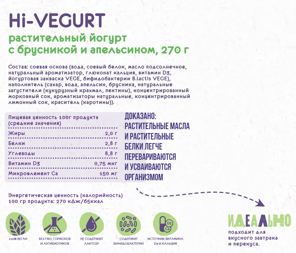 Соевая основа (вода, соевый белок, масло подсолнечное, натуральный ароматизатор, глюконат кальция, витамин D3, йогуртовая закваска VEGE, бифидобактерии B. lactis VEGE), наполнитель (сахар, вода, апельсин, брусника, натуральные загустители (кукурузный крахмал, пектины), концентрированный морковный сок, ароматизаторы натуральные, концентрированный лимонный сок, краситель (каротины)).