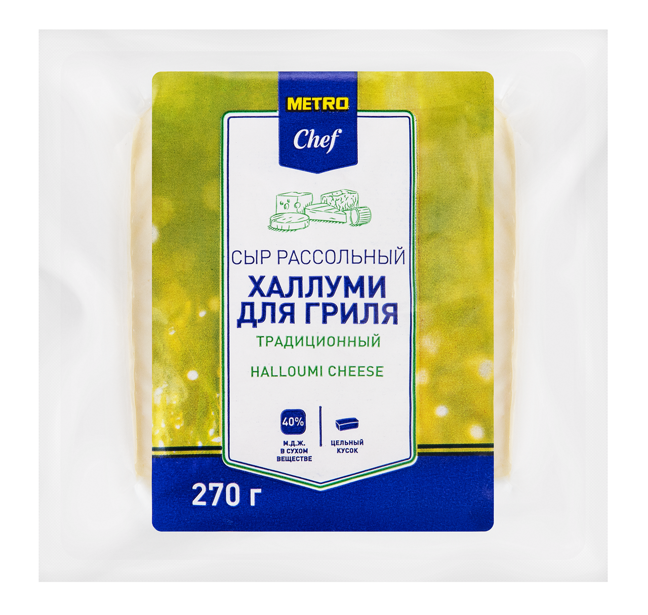 Metro Chef Сыр Халлуми рассольный 40%, 270г – мягкий рассольный сыр для гриля белого цвета, с отличительной слоистой текстурой, имеет слабо соленый вкус. Хранится в рассоле и может сохраняться до одного года, если заморожен ниже 18 C. Левантийский сыр Халлуми, известен в Европе по кипрской кухне. Сочный, ароматный Халлуми изготавливается по традиционному рецепту из коровьего молока или из смеси козьего, овечьего и коровьего молока. Его можно обжарить или приготовить на гриле.