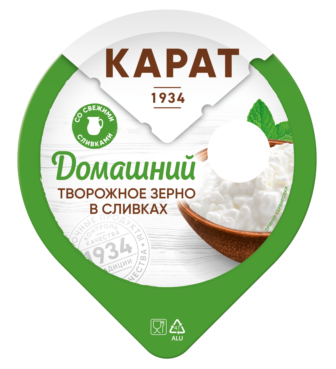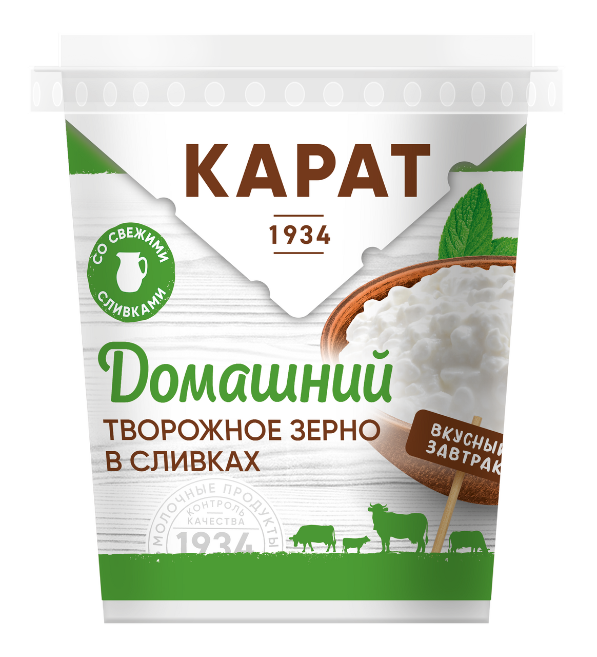 Представляем творожное зерно в сливках Карат Домашний. Это творожное зерно на живой закваске с добавлением цельного молока и свежих сливок, именно благодаря им творог получается таким нежным и вкусным. Карат Домашний основатель категории зерненого творога в России. Именно на заводе Карат в 1978 году был впервые произведён инновационный, разработанный технологами предприятия продукт. Производится из натурального молока, закваски и сливок. В рецептуре увеличено содержание сливок, чтобы сохранить естественную и мягкую форму творожного зерна. Здесь нет консервантов и вкусовых добавок - продукт хранится всего 17 дней. Добавляйте варенье, мед, фрукты прямо в стакан с творогом и наслаждайтесь полезным завтраком.