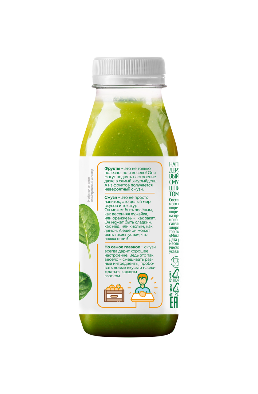 Сок яблочный прямого отжима, пюре яблока, пюре банана, пюре груши, пюре шпината, сок апельсина прямого отжима, сок лимона прямого отжима, краситель - медные комплексы хлорофиллинов, ароматизатор пищевой натуральный мята перечная.