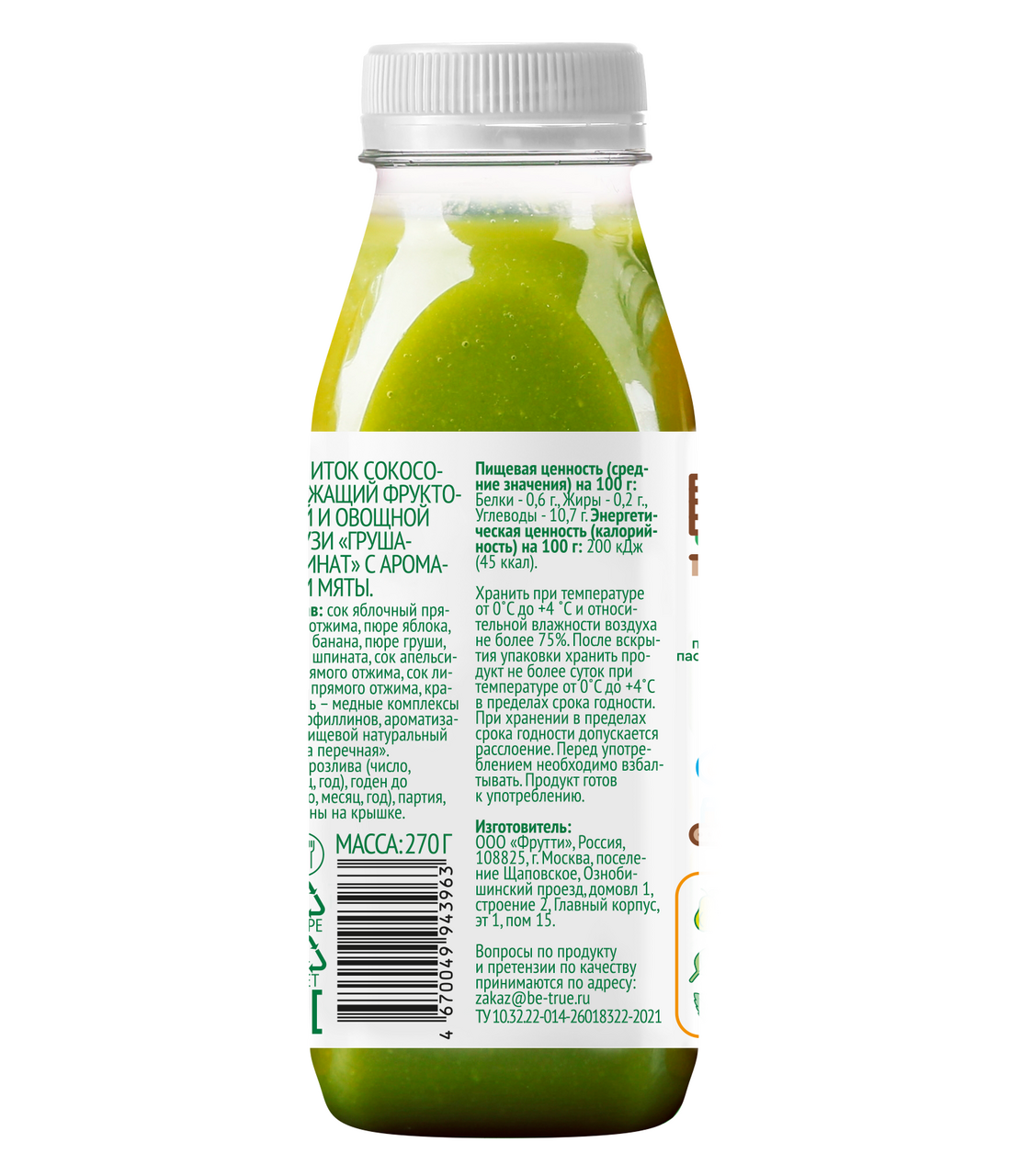 Смузи Be True Груша-Шпинат с ароматом мяты, 270мл