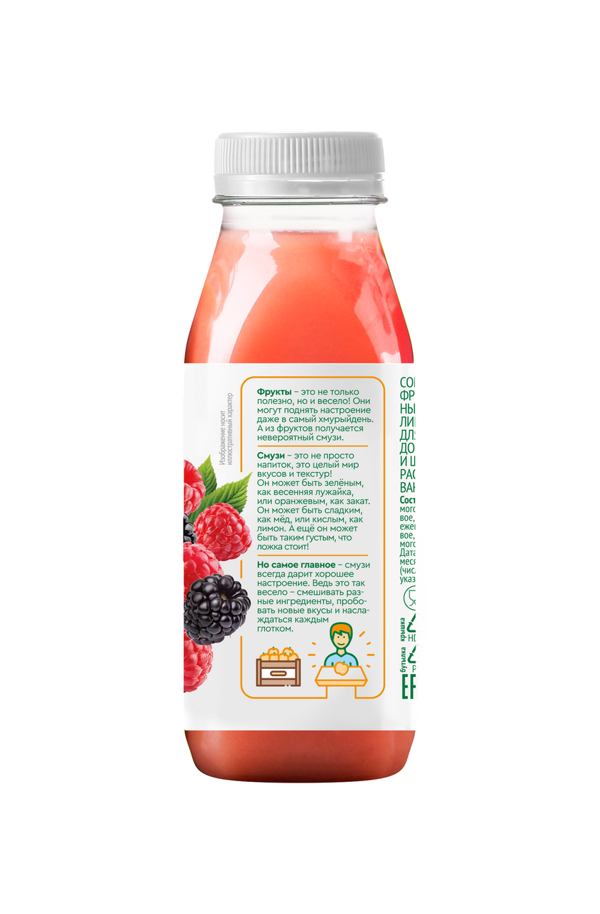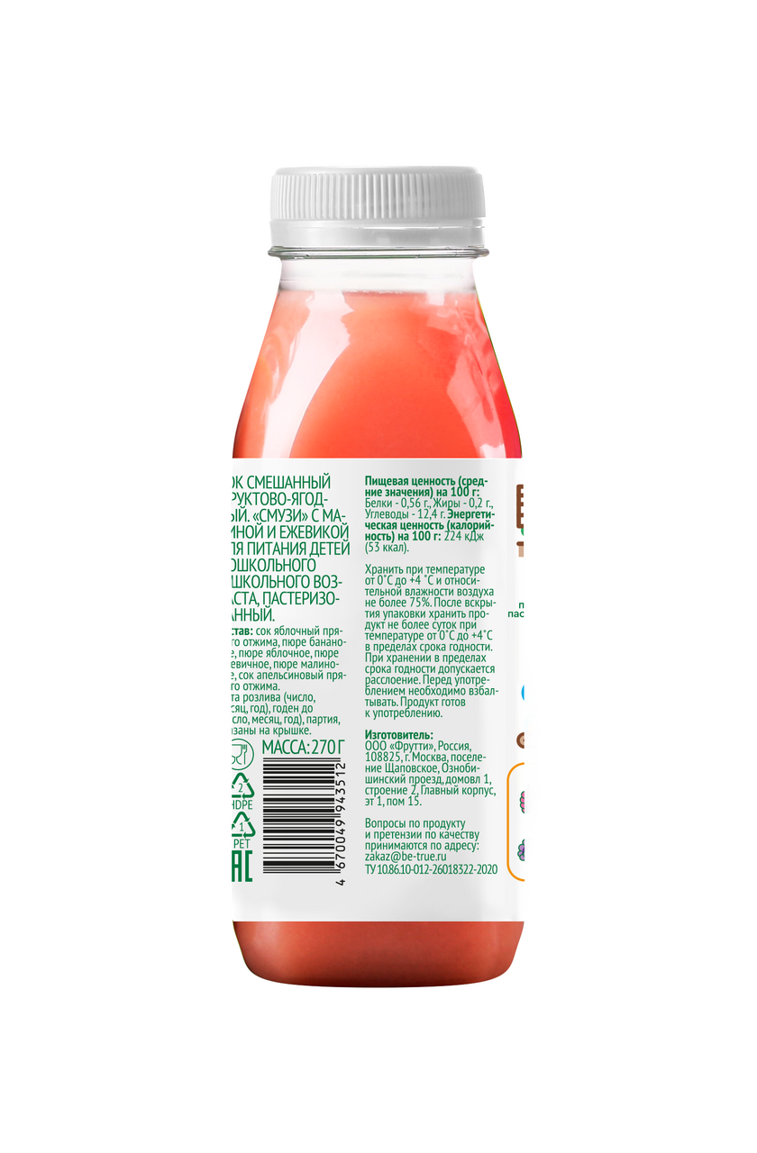 Порадуйте ваших детей вкусным и полезным смузи Малина+Ежевика от BeTrue! В составе – яблочный сок прямого отжима, банановое и яблочное пюре, пюре ежевики и малины, апельсиновый сок прямого отжима. Это идеальное сочетание натуральных ингредиентов обеспечит вашего ребенка витаминами и энергией на весь день. Наслаждайтесь натуральным вкусом ягод с BeTrue!