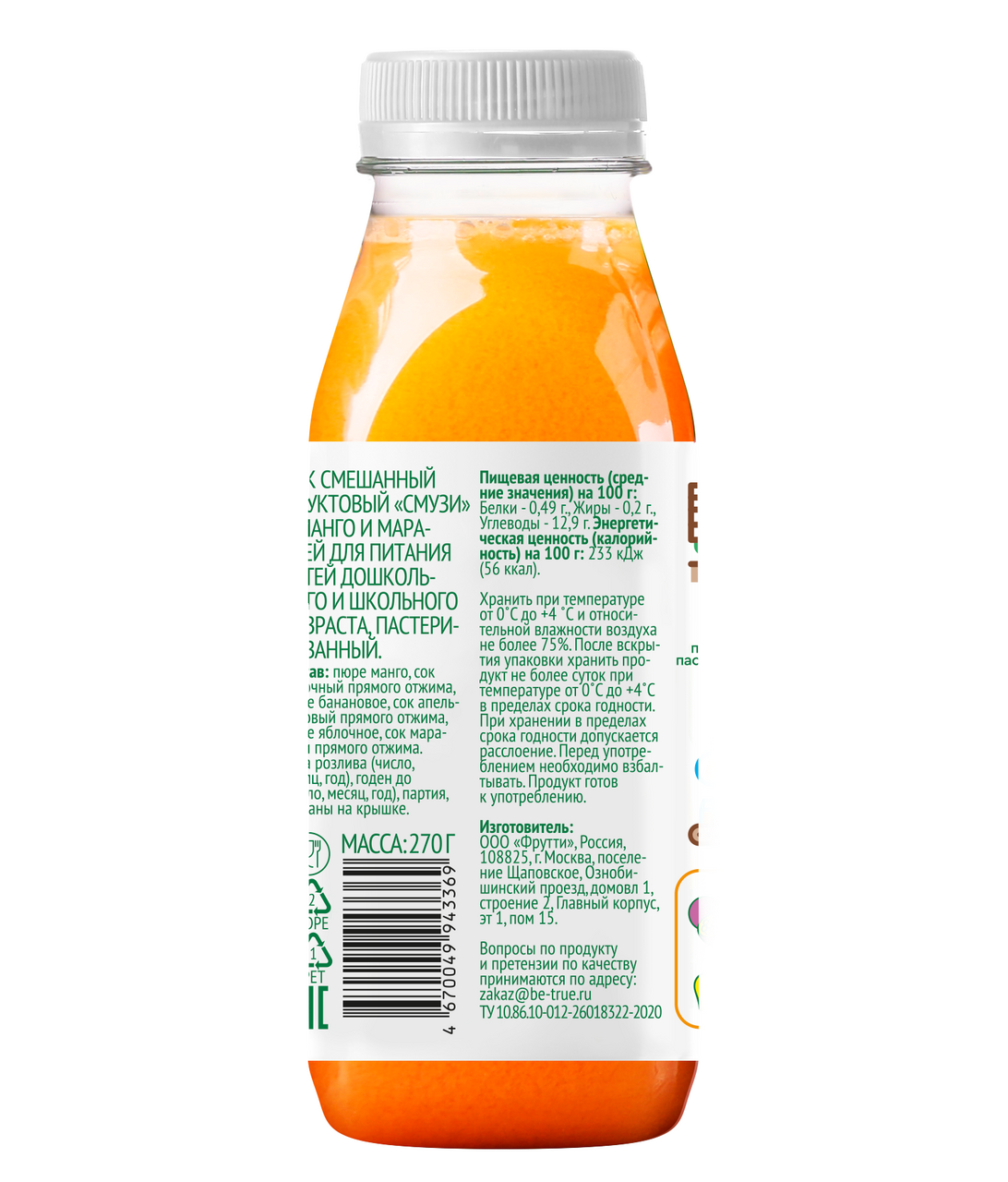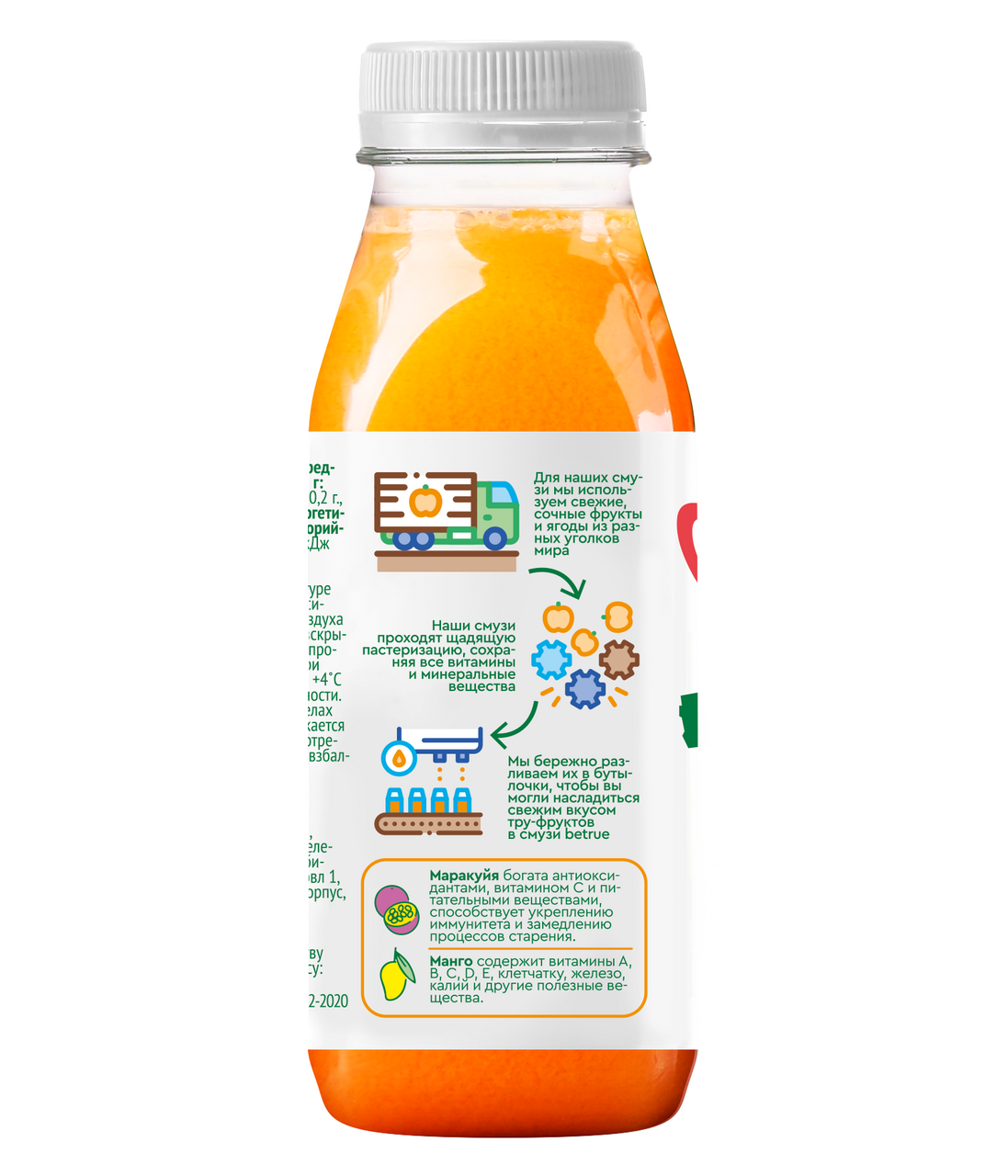 Подарите вашим детям тропическое наслаждение с смузи Манго+Маракуйя от BeTrue! В составе – пюре манго, яблочный сок прямого отжима, банановое и яблочное пюре, апельсиновый сок прямого отжима и сок маракуйи прямого отжима. Яркий и насыщенный вкус тропических фруктов порадует вашего ребенка и обеспечит его необходимыми витаминами. Наслаждайтесь натуральным тропическим вкусом с BeTrue!