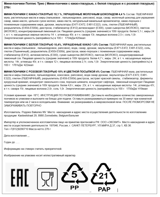 Мини-пончики с какао-глазурью, украшенные молочным шоколадом: пшеничная мука, растительные масла и жиры пальмовое, пальмоядровое, рапсовое, вода, сахар, молочный шоколад для украшения: сахар, какао-масло, цельное сухое молоко, какао-паста, натуральный ванильный ароматизатор, какао-порошок с пониженным содержанием жира, дрожжи, эмульгаторы e471-e472-e481-e322, соль, глютен; мини-пончики с белой глазурью 10,4%, украшенные какао: пшеничная мука, растительные масла и жиры пальмовое, пальмоядровое, рапсовое, вода, сахар, дрожжи, эмульгаторы e471-e472e-e481-e322, соль, глютен пшеничный, разрыхлитель e450i-e500ii, декстроза, какао-порошок с пониженным содержанием жира, стабилизатор e412, антиокислитель е300, сухая сыворотка молоко, лактоза молоко, концентрированный лимонный сок пшеничный, разрыхлитель e450i-e500ii, декстроза, стабилизатор e412,антиоксидант е300, сухая сыворотка молоко, лактоза молоко, концентрированный лимонный сок; мини-пончики с розовой глазурью и цветной посыпкой: пшеничная мука, растительные масла и жиры пальмовое, пальмоядровое, кокосовое, рапсовое, вода сахар дрожжи, эмульгаторы e471-e472-e481-e322, глютен пшеничный, разрыхлитель e450i-e500ii декстроза, экстракт красной свеклы, стабилизатор, ферменты кукурузный крахмал, концентрат свекольного сока, порошок шпината, концентрат сафлора, лимонный концентрат.