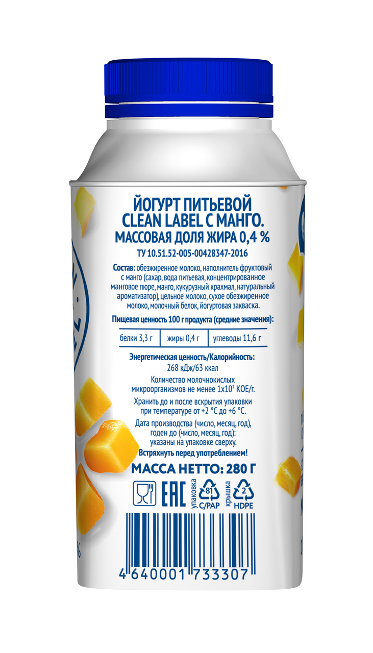 Обезжиренное молоко, наполнитель фруктовый с манго (сахар, вода, манго, концентрирован-ное манговое пюре, кукурузный крахмал, натуральный ароматизатор манго), цельное молоко, сухое обезжиренное молоко, молочный белок, йогуртовая закваска.