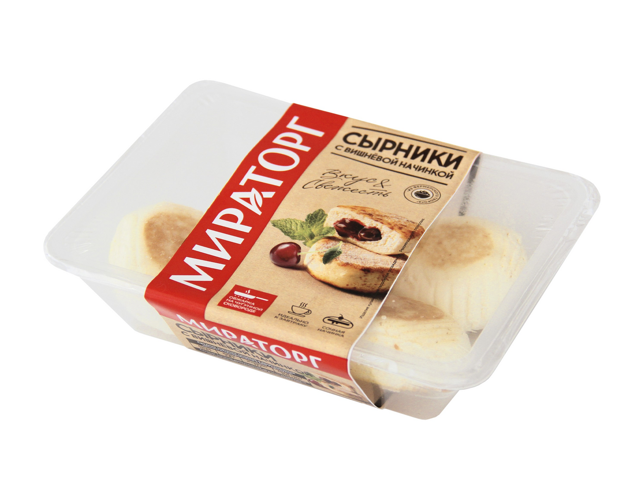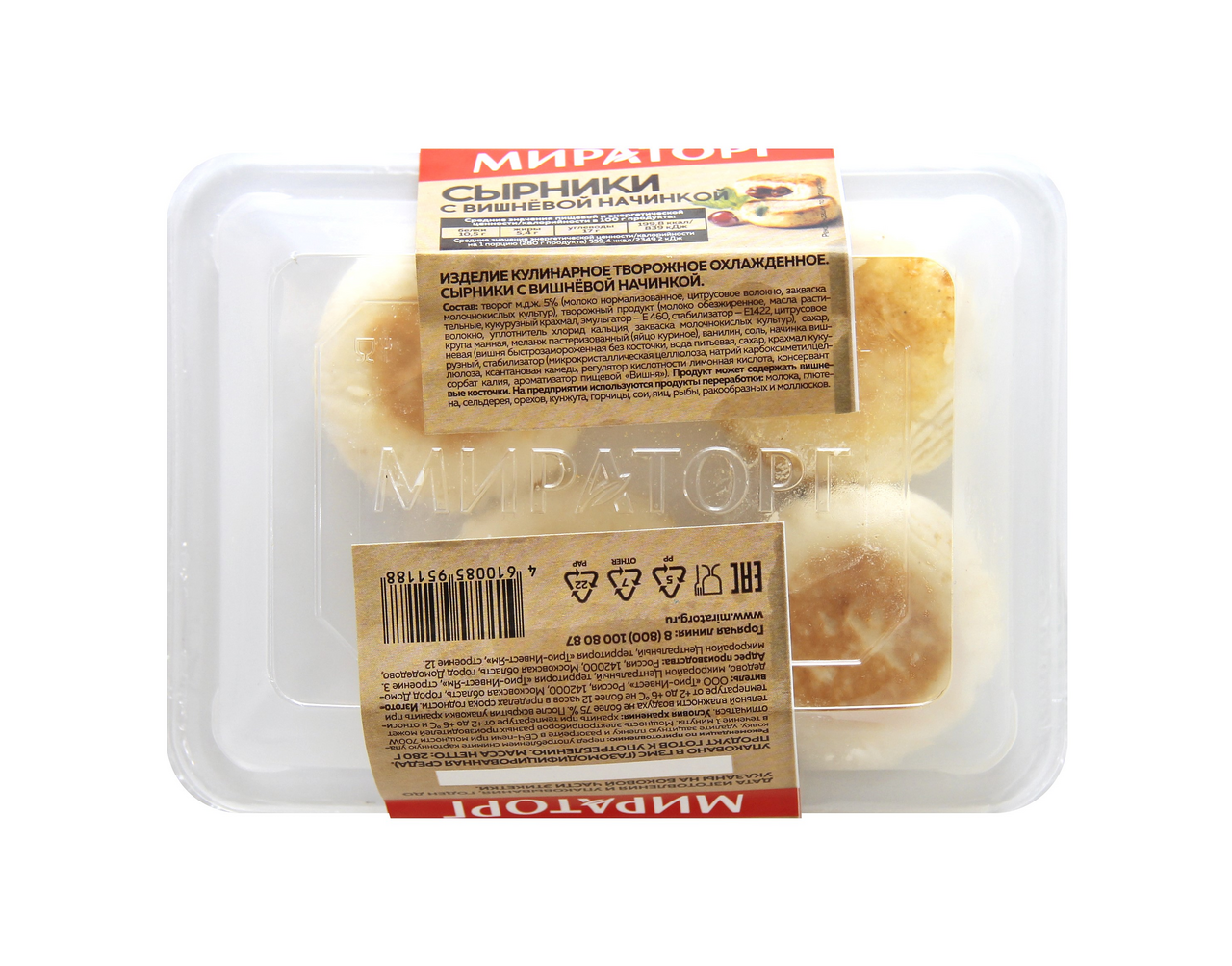 Творог м. д. ж. 5% молоко нормализованное, цитрусовое волокно, закваска молочнокислых культур, творожный продукт молоко обезжиренное, масла растительные, кукурузный крахмал, эмульгатор – Е 460, стабилизатор – Е1422, цитрусовое волокно, уплотнитель хлорид кальция, закваска молочнокислых культур, сахар, крупа манная, меланж пастеризованный яйцо куриное, ванилин, соль, начинка вишневая вишня быстрозамороженная без косточки, вода питьевая, сахар, крахмал кукурузный, стабилизатор микрокристаллическая целлюлоза, натрий карбоксиметилцеллюлоза, ксантановая камедь, регулятор кислотности лимонная кислота, консервант сорбат калия, ароматизатор пищевой Вишня. Продукт может содержать вишневые косточки.