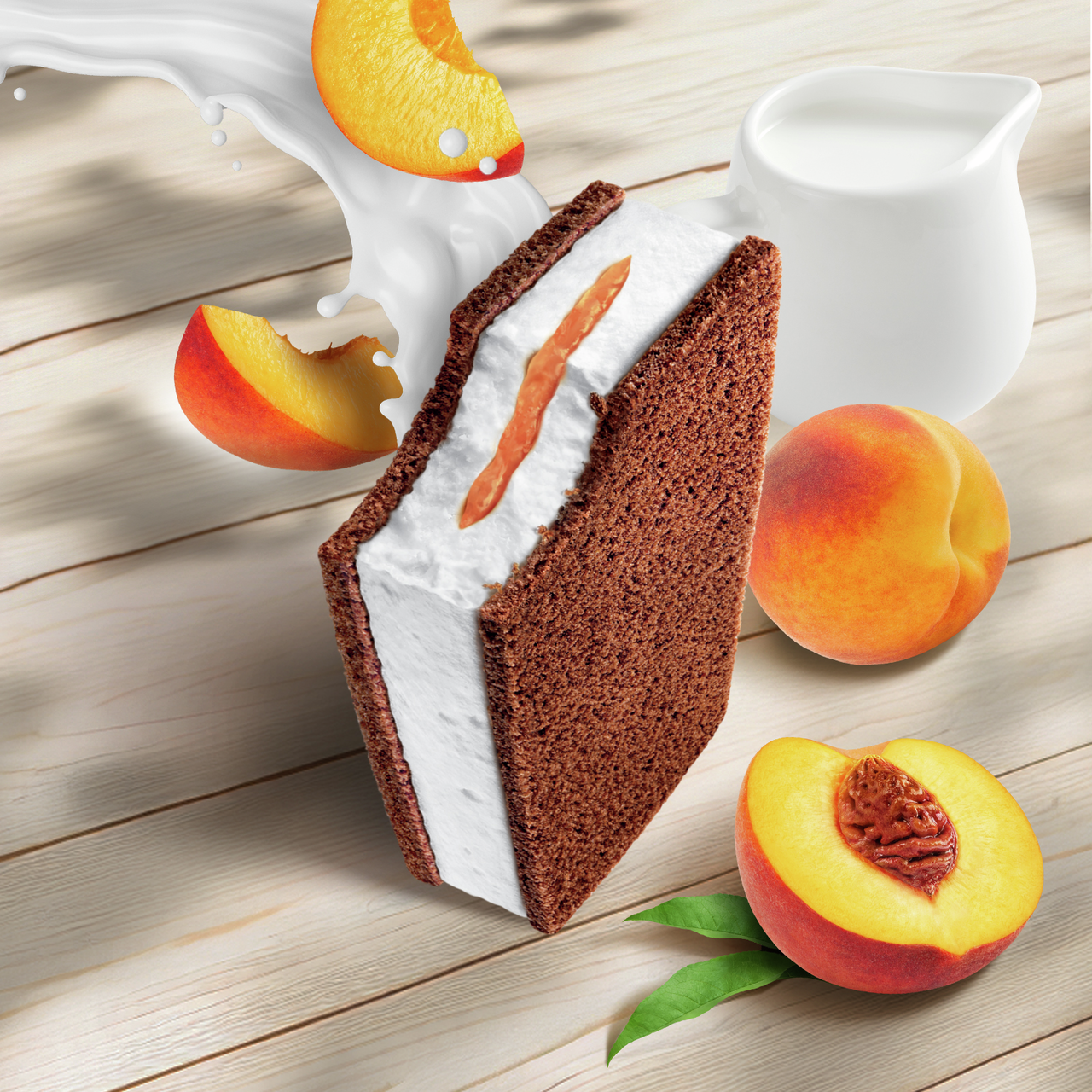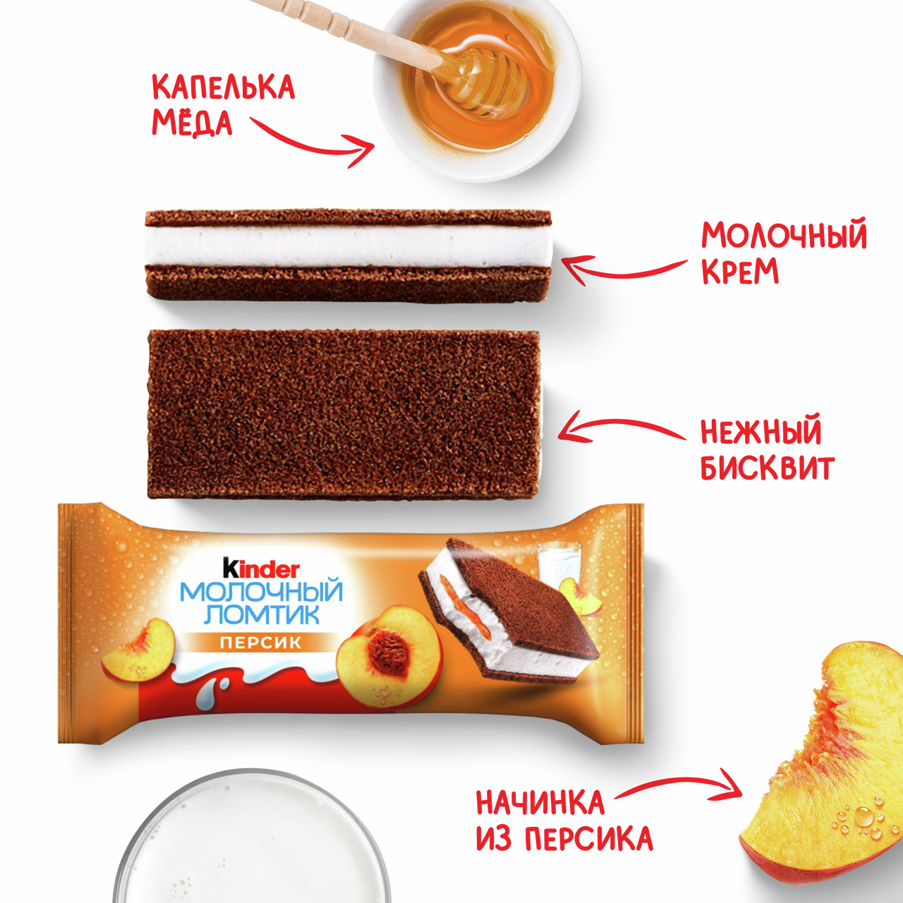 Пастеризованное молоко, растительный жир, сахар, фруктовая начинка из персика (персиковое пюре, сахар, глюкозный сироп, загуститель: пектин, регулятор кислотности: лимонная кислота, ароматизатор), пшеничная мука, сухое обезжиренное молоко, мёд, яичный порошок, обезвоженный молочный жир, обезжиренный какао-порошок, пшеничные отруби, разрыхлители: дигидропирофосфат натрия, гидрокарбонат натрия и карбонад аммония, эмульгатор: моно- и диглицериды жирных кислот, соль, ароматизаторы. Содержит: Содержит молоко, яйца, злаки, содержащие глютен, сою и продукты их переработки. Может содержать следы орехов, сои и продуктов их переработки.