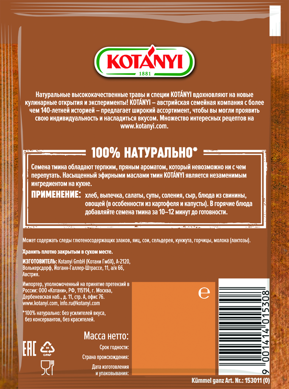 Семена тмина обладают терпким, пряным ароматом, который невозможно ни с чем перепутать. Насыщенный эфирными маслами тмин является незаменимым ингредиентом на кухне. Применение: хлеб, выпечка, салаты, супы, соления, сыр, блюда из свинины, овощей (в особенности из картофеля и капусты). В горячие блюда добавляйте семена тмина за 10–12 минут до готовности.