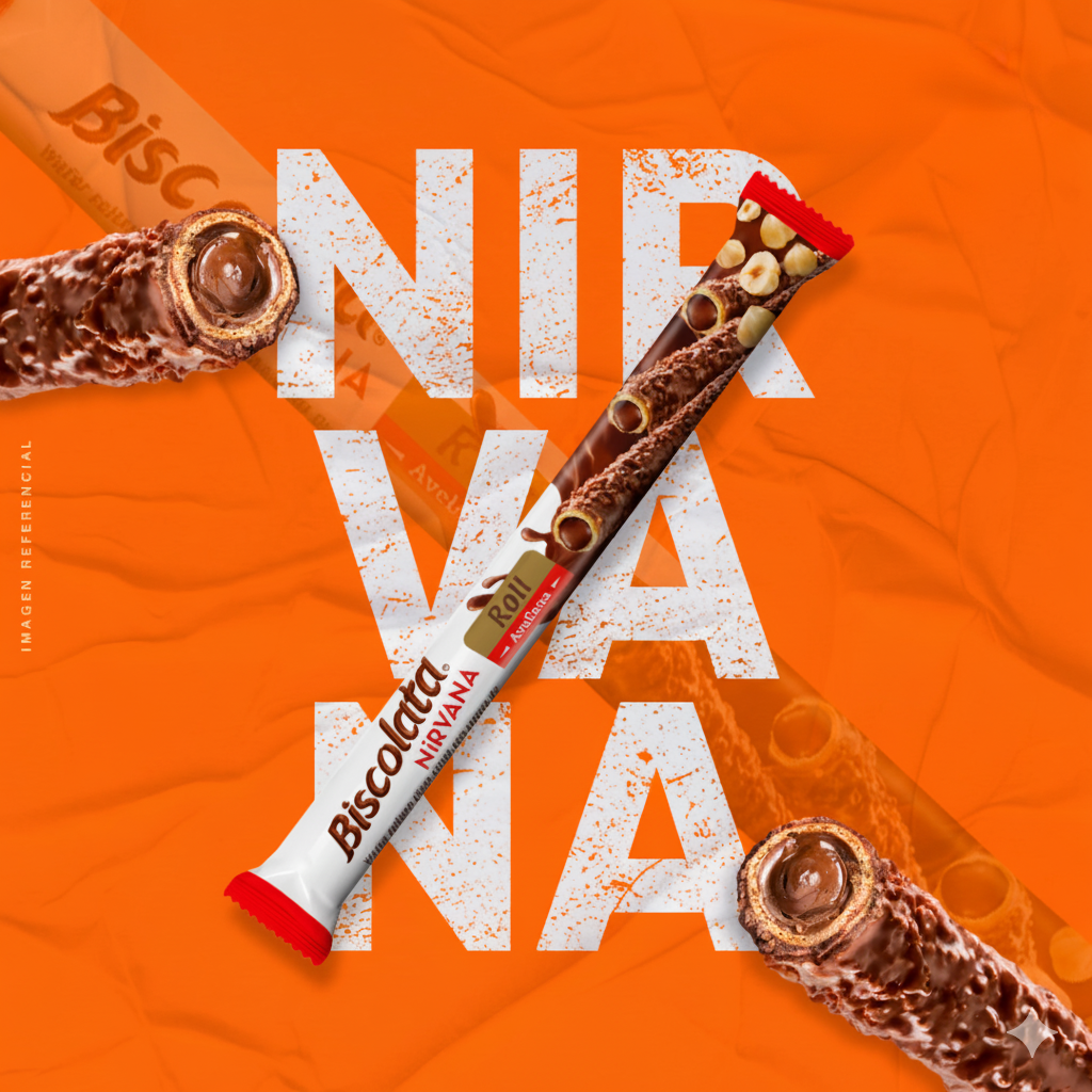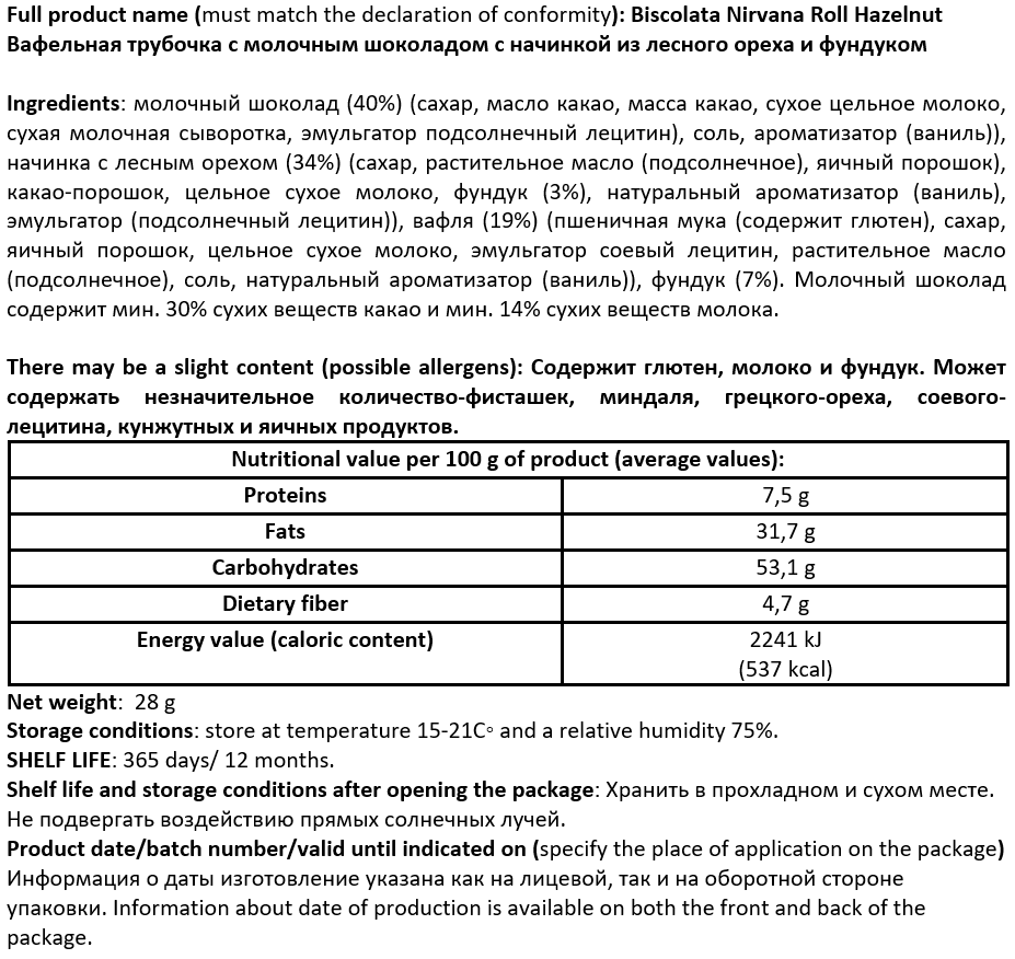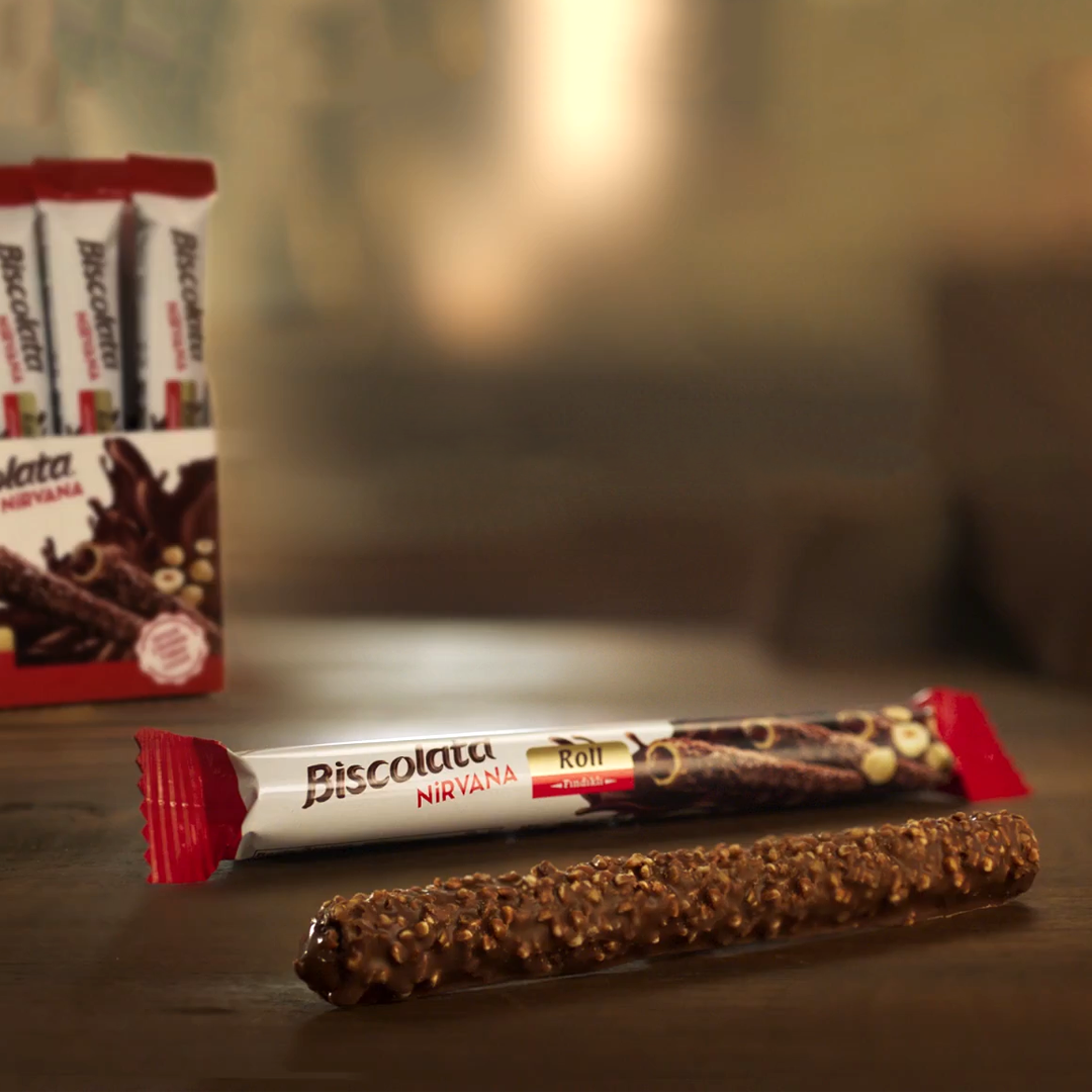 Трубочка вафельная Biscolata Nirvana Roll Hazelnut с молочным шоколадом, начинкой из лесного ореха и фундуком, 28г