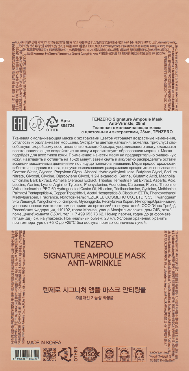 Маска для лица Tenzero тканевая омолаживающая цветочный экстракт, 28мл