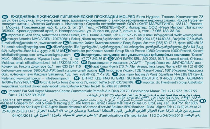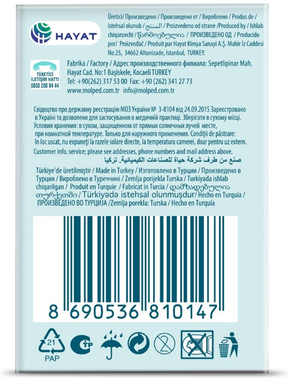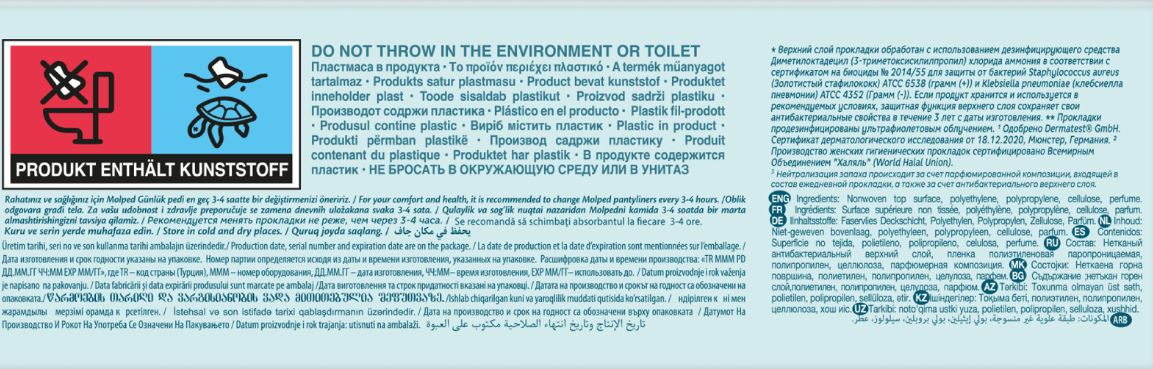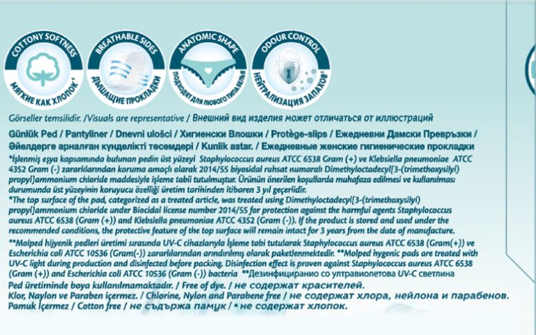 Прокладки Molped Extra Hygienecантибактериальным верхним слоем и добавлением парфюмерной композиции помогают предотвратить неприятный запах, вызываемый бактериями. Верхний слой прокладки обработан с использованием дезинфицирующего средства, которое блокирует рост бактерий на поверхности прокладки. Molped Extra Hygiene протестированы дерматологами и обеспечат максимальныйкомфорт коже. Подарят чувство свежести и комфорта, помогут справиться с неприятным запахом и предотвратят рост бактерий. Без рисунка, тисненые, с антибактериальным впитывающим слоем зеленого цвета, который предотвращает образование бактерий и неприятных запахов. С суперабсорбентом (гидрофильный акриловый полимер). Поверхность мягкая сеточка. За счет парфюмированной композиции и антибактериального впитывающего слоя Вы будете чувствовать только свежесть. Верхний слой прокладки покрыт дополнительной защитной пленкой, обеспечивая дополнительную защиту от бактерий. Прокладки продезинфицированы ультрафиолетовым облучением.