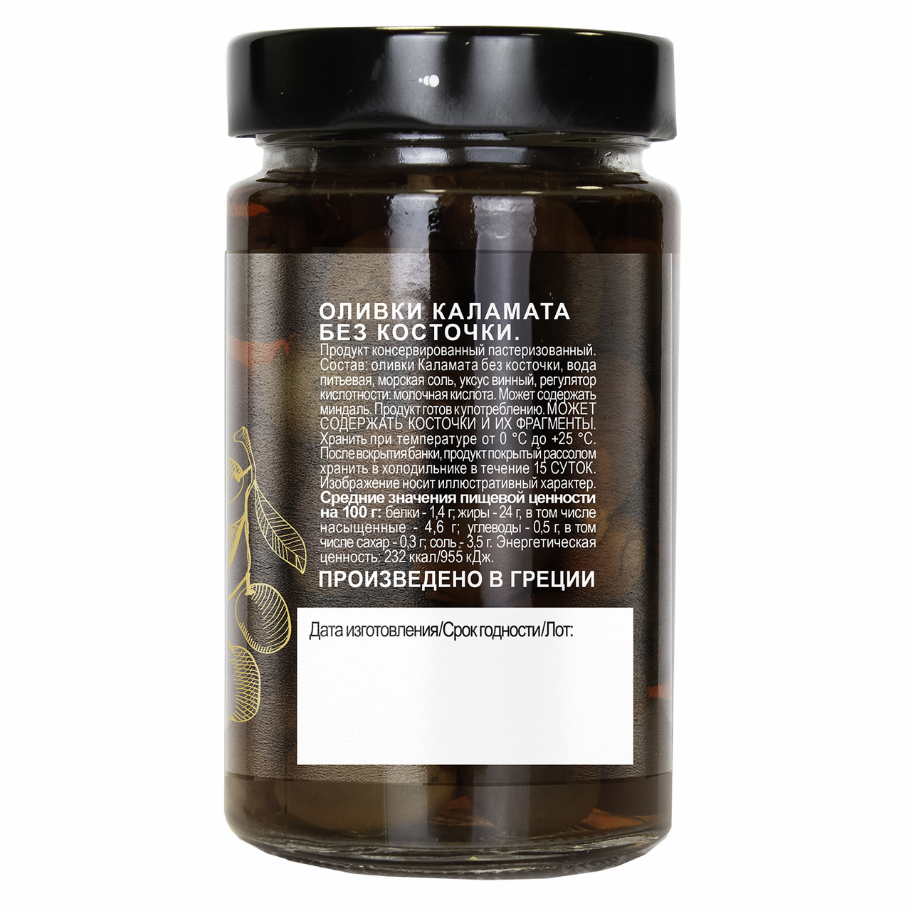 Оливки Каламата без косточки, вода питьевая, морская соль, уксус винный, регулятор кислотности: молочная кислота.