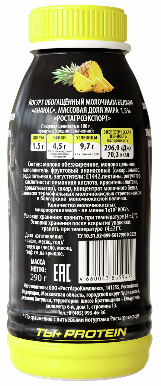 Йогурт питьевой Ростагроэкспорт протеиновый ананас 1.5%, 290г