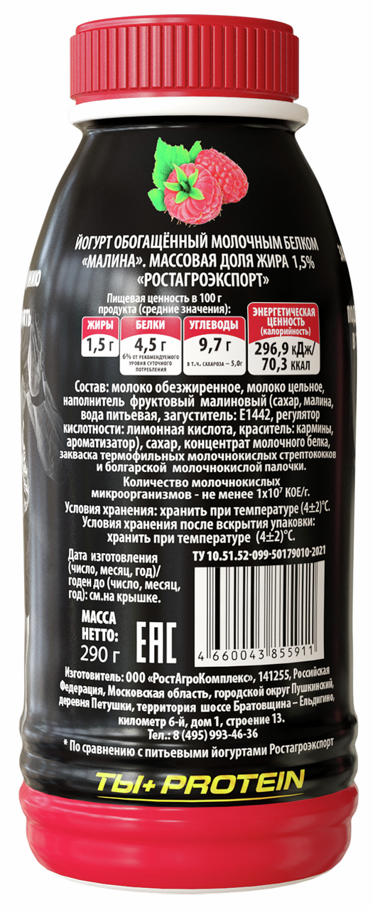 Йогурт питьевой Ростагроэкспорт протеиновый малина 1.5%, 290г