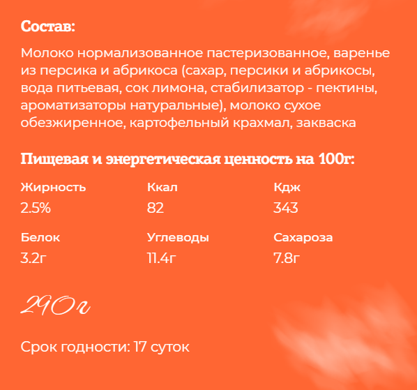 Молоко нормализованное пастеризованное, варенье из персика и абрикоса (сахар, персики и абрикосы, вода питьевая, сок лимона, стабилизатор - пектины, ароматизаторы натуральные), молоко сухое обезжиренное, картофельный крахмал, закваска.