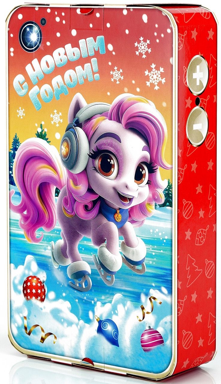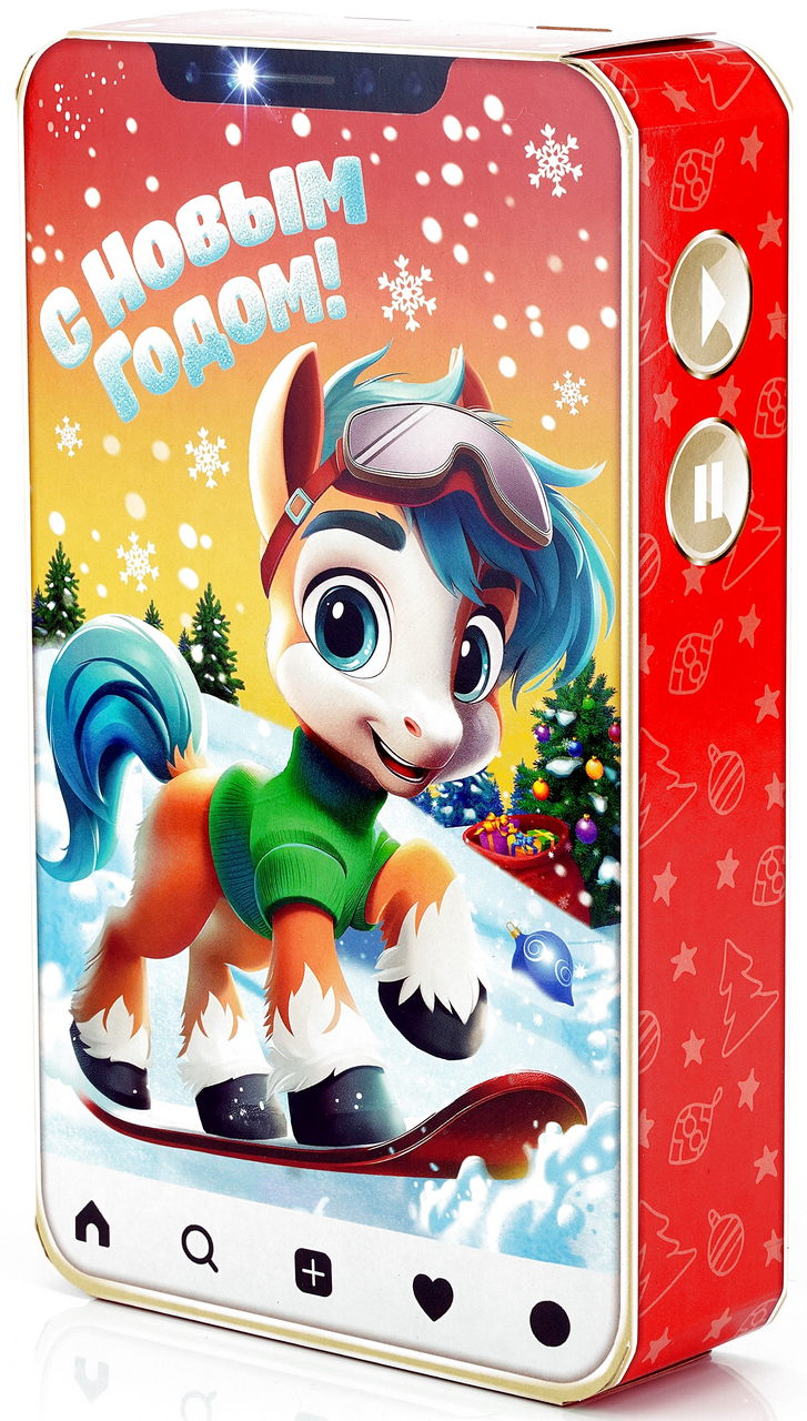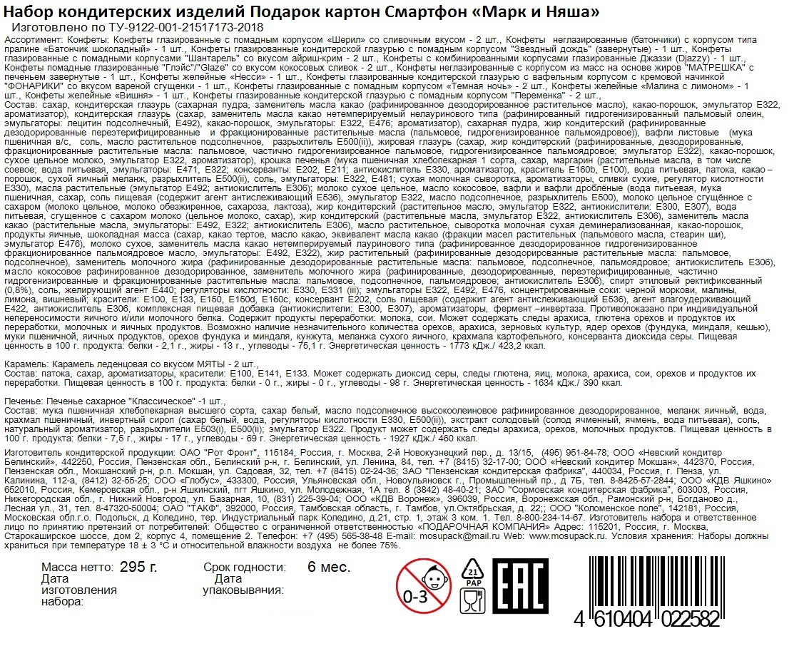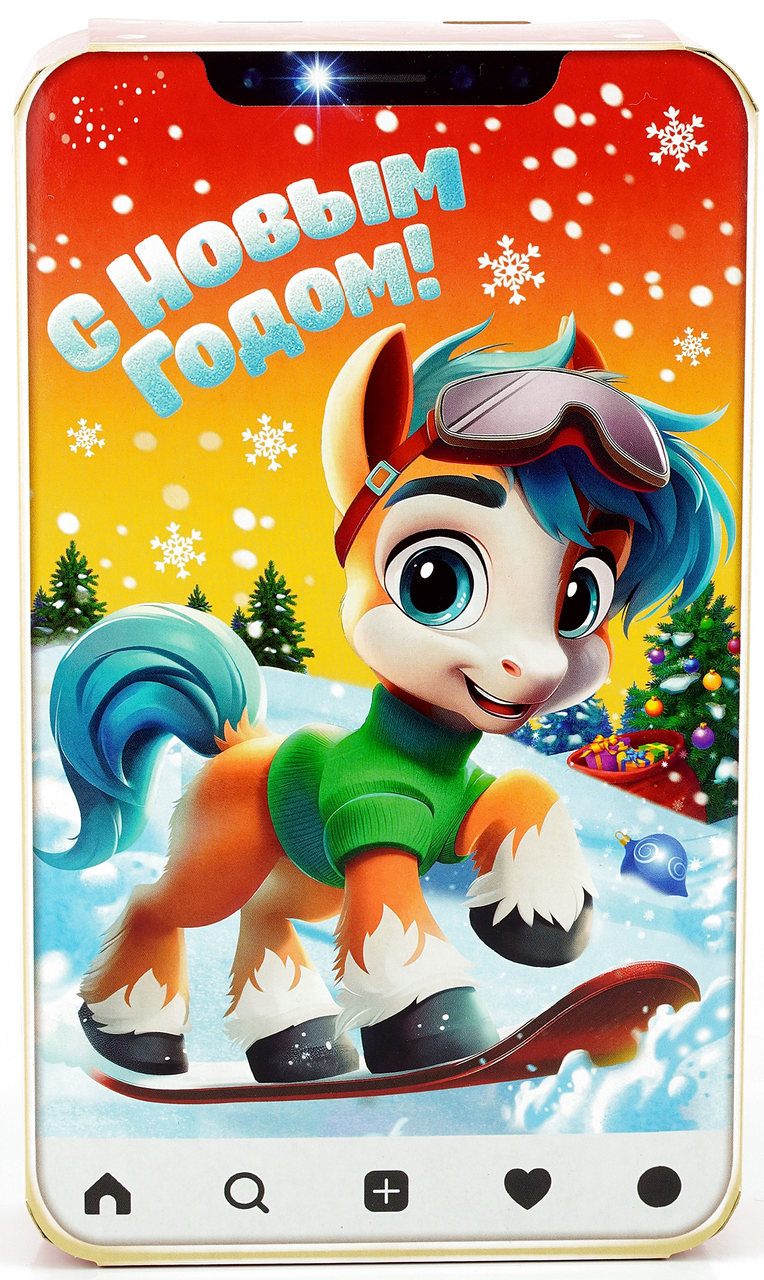 Сладкий набор, МосУпак, Подарок Смартфон Марк и Няша - 295гр, содержит кондитерские изделия кондитерских фабрик Невский кондитер, Объединенные кондитеры, КДВ, Коломенское поле. Оригинальный новогодний сюжет с участием двух лошадок. Такой подарок можно подарить любому члену семьи, и старшему и младшему. Форма говорящая сама за себя. Кондитерские изделия упакованы в отдельный пластиковый пакет, который находится внутри подарочной картонной коробки.