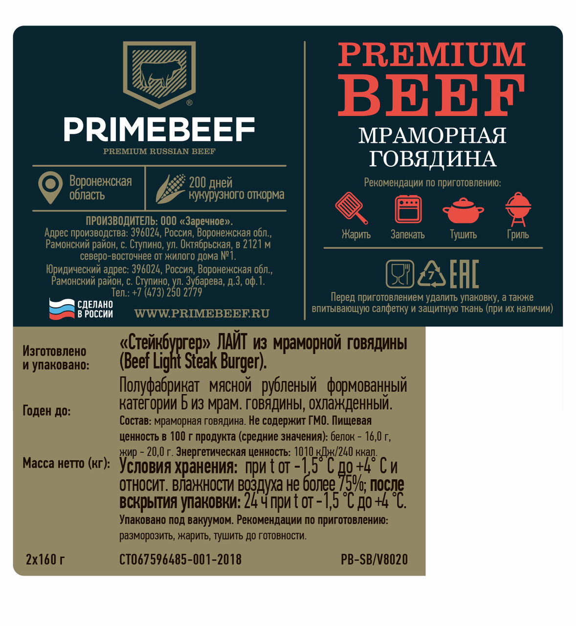 Стейкбургер Primebeef Лайт 80/20 охлажденный (160г x 2шт), 320г
