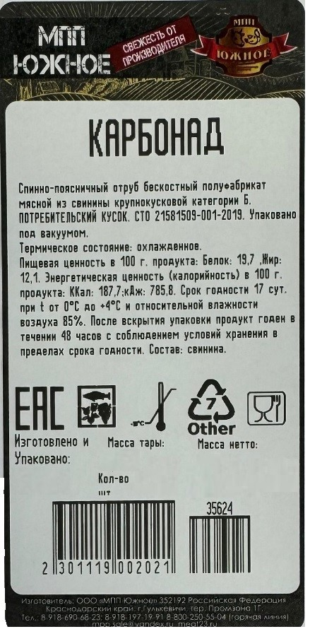 Карбонад свиной МПП Южное охлажденный, ~2кг