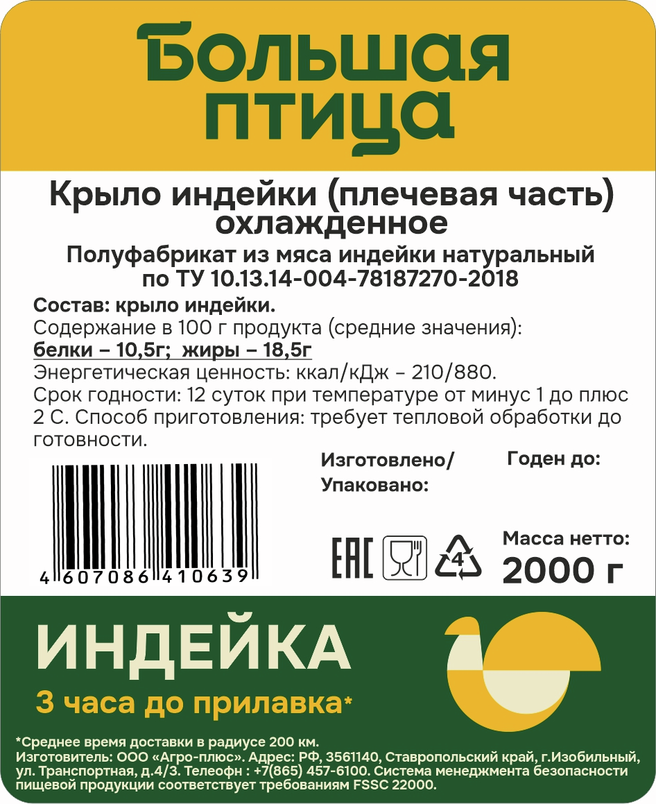 Крыло индейки Большая птица плечевая часть охлажденная, ~2кг