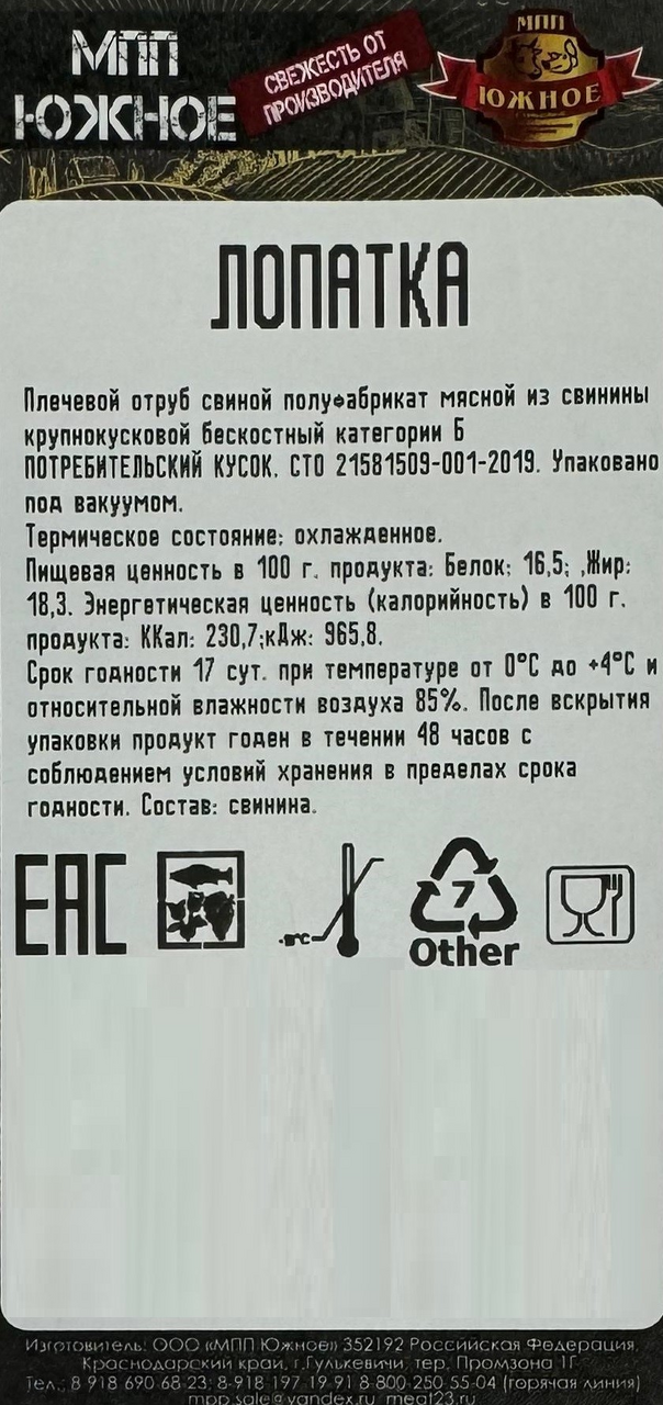 Лопатка свиная МПП Южное охлажденная, ~2кг