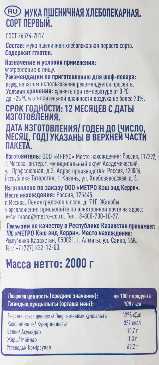 METRO Chef Мука пшеничная хлебопекарная первый сорт, 2кг
