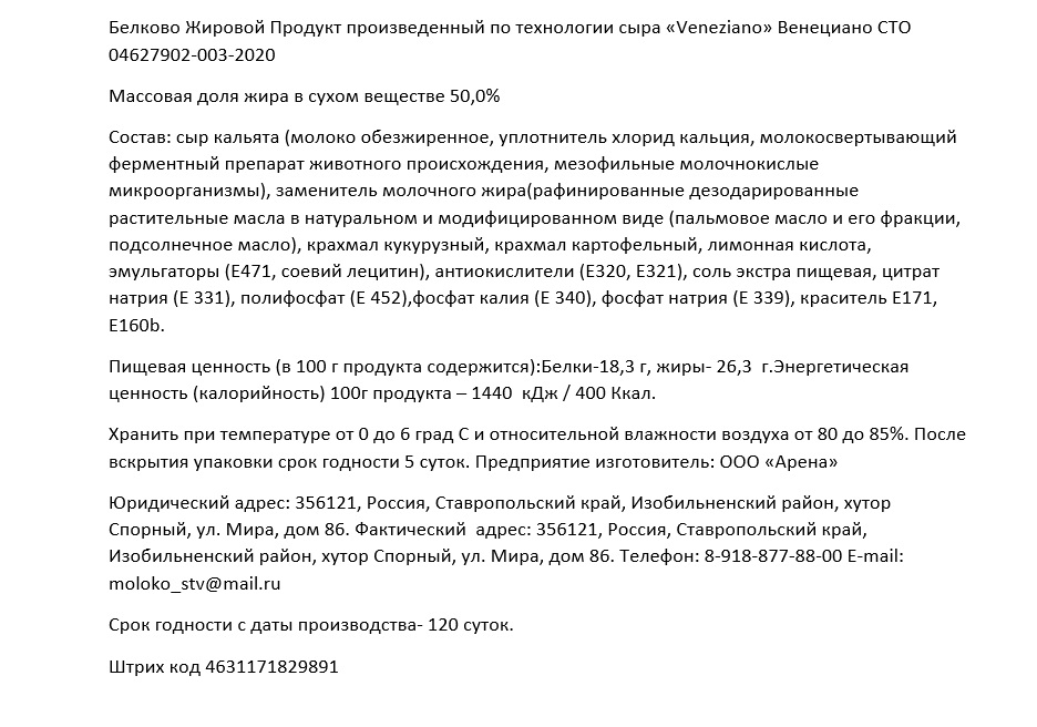 Сыр кальята (молоко обезжиренное, уплотнитель хлорид кальция, молокосвертывающий ферментный препарат животного происхождения, мезофильные молочнокислые микроорганизмы), заменитель молочного жира (рафинированные дезодорированные растительные масла в натуральном и модифицированном виде (пальмовое масло и его фракции, подсолнечное масло)), крахмал кукурузный, крахмал картофельный, лимонная кислота, эмульгаторы Е471, соевый лецитин, антиокислители Е320, Е321, соль экстра пищевая, цитрат натрия Е331, полифосфат Е452, фосфат калия Е340, фосфат натрия Е339, краситель Е171, Е160b.