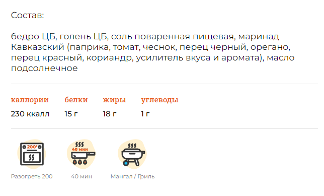 Бедро ЦБ, голень ЦБ, соль поваренная пищевая, маринад Кавказский (паприка, томат, чеснок, перец черный, орегано, перец красный, кориандр, усилитель вкуса и аромата), масло подсолнечное.