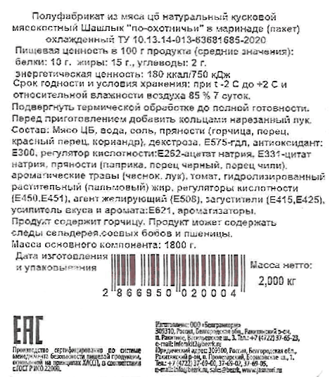 Шашлык из мяса цыпленка-бройлера Куриный король По-охотничьи охлажденный, ~2кг