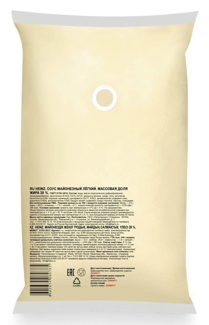 Готовый соус Майонезный легкий 28% Heinz обладает классическим сливочным вкусом и густой однородной текстурой при низкой жирности.Купить готовый соус Майонезный легкий 28% Heinz можно в специальной упаковке балк для профессиональных кухонь ресторанов и отелей, кафе и баров. Балк 2кг подходит для специальных дозаторов Heinz — благодаря съёмным пакетам их удобно использовать при сервировке шведского стола и раздаточных линий, кейтеринга и корпоративного обслуживания. Формат балк для HoReCa обеспечивает гигиеническую защиту, реализацию продукта равномерными порциями и без потерь, удобное хранение, транспортировку и утилизацию.