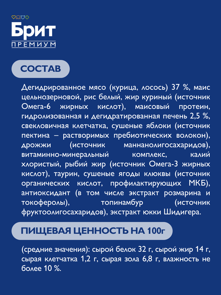 Дегидрированное мясо курица, лосось, маис цельнозерновой, рис, жир куриный источник Омега-6 жирных кислот, маисовый протеин, гидролизованная и дегидратированная печень, свекловичная клетчатка, яблоки, дрожжи источник маннанолигосахаридов, витаминно-минеральный комплекс, калий хлористый, рыбий жир источник Омега-3 жирных кислот, таурин, клюква, антиоксидант в том числе экстракт розмарина и токоферолы, топинамбур источник фруктоолигосахаридов, экстракт юкки Шидигера.