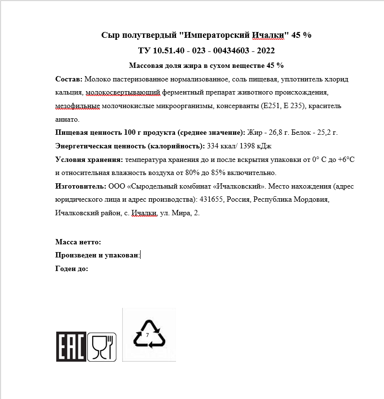 Молоко пастеризованное нормализованное, соль пищевая, уплотнитель хлорид кальция, молокосвертывающий ферментный препарат животного происхождения, мезофильные молочнокислые микроорганизмы, консерванты Е251, Е235, краситель аннато.