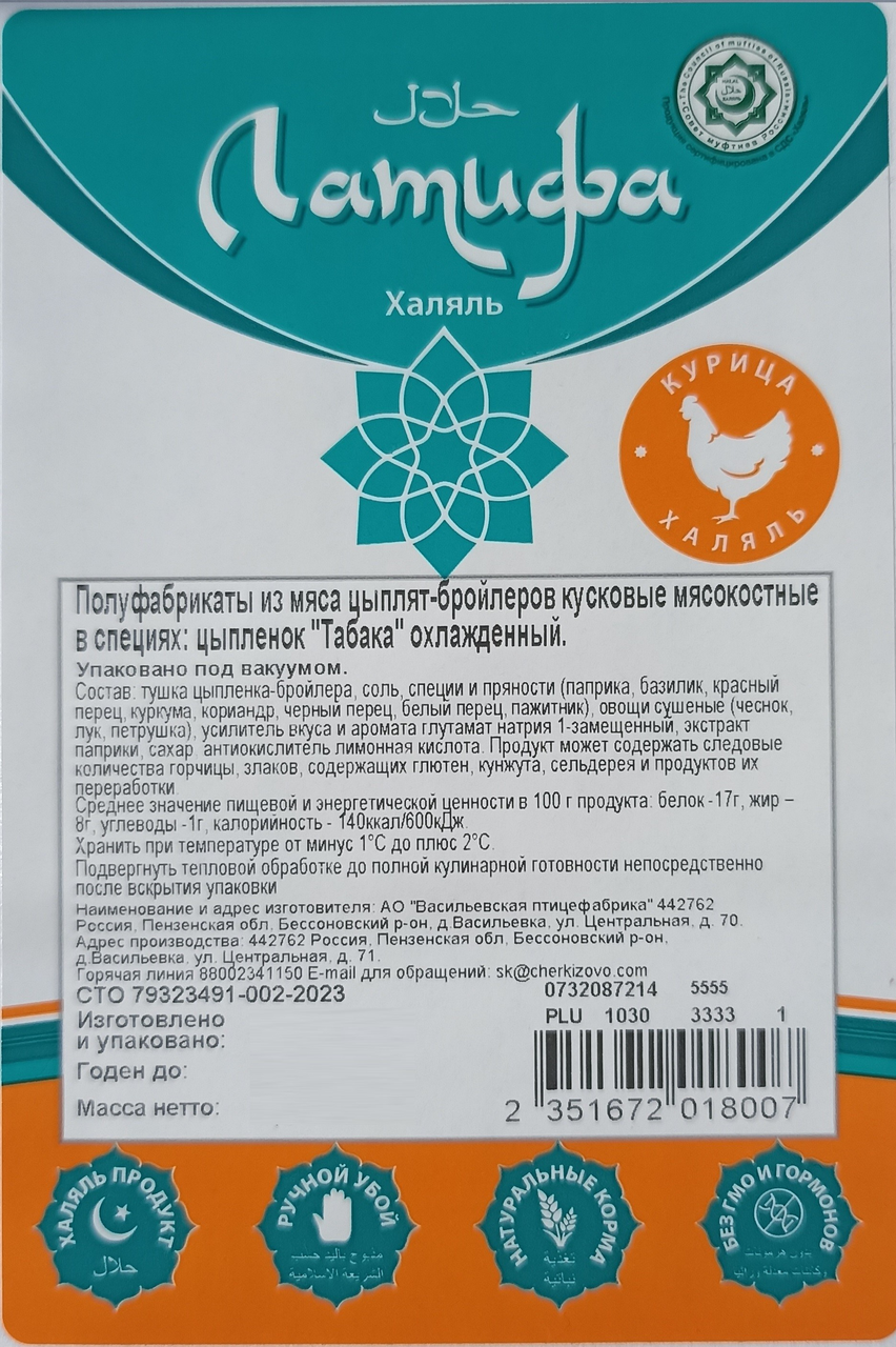 Цыпленок табака Латифа Халяль охлажденный, ~2кг