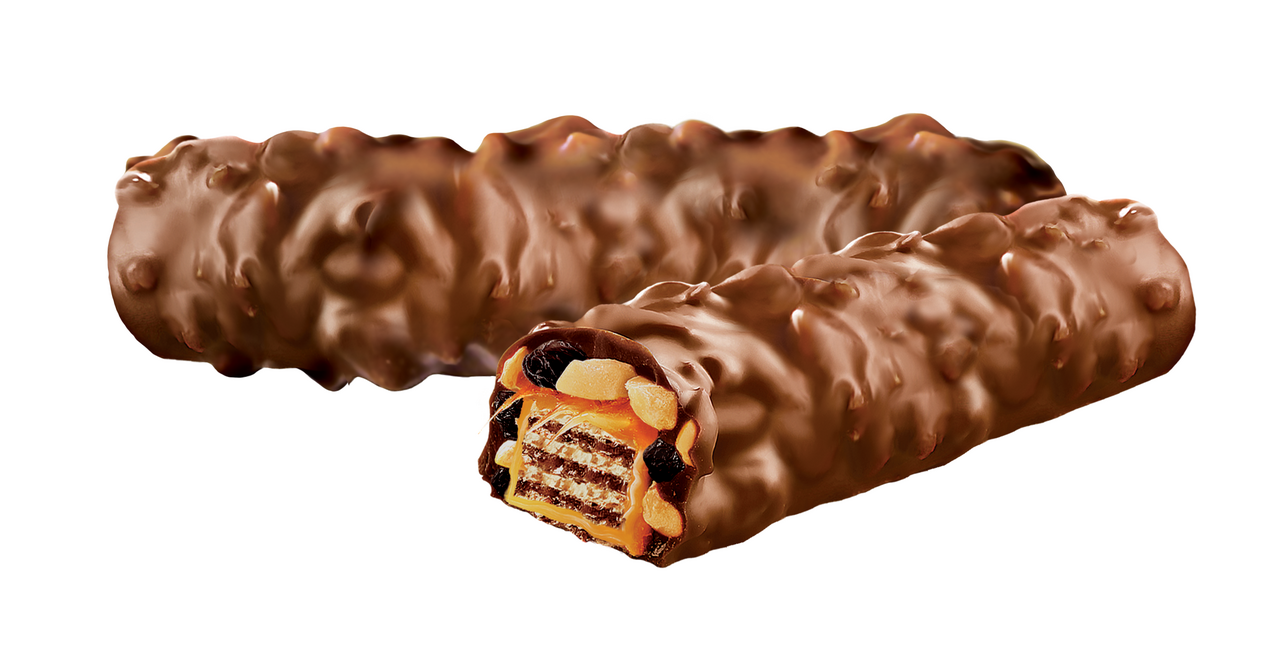 Вафля с начинкой из натурального какао, покрытая мягкой карамелью с добавлением изюма и обжаренного арахиса. Вафля покрыта молочным шоколадом. При производстве используется только свежее качественное сырье.