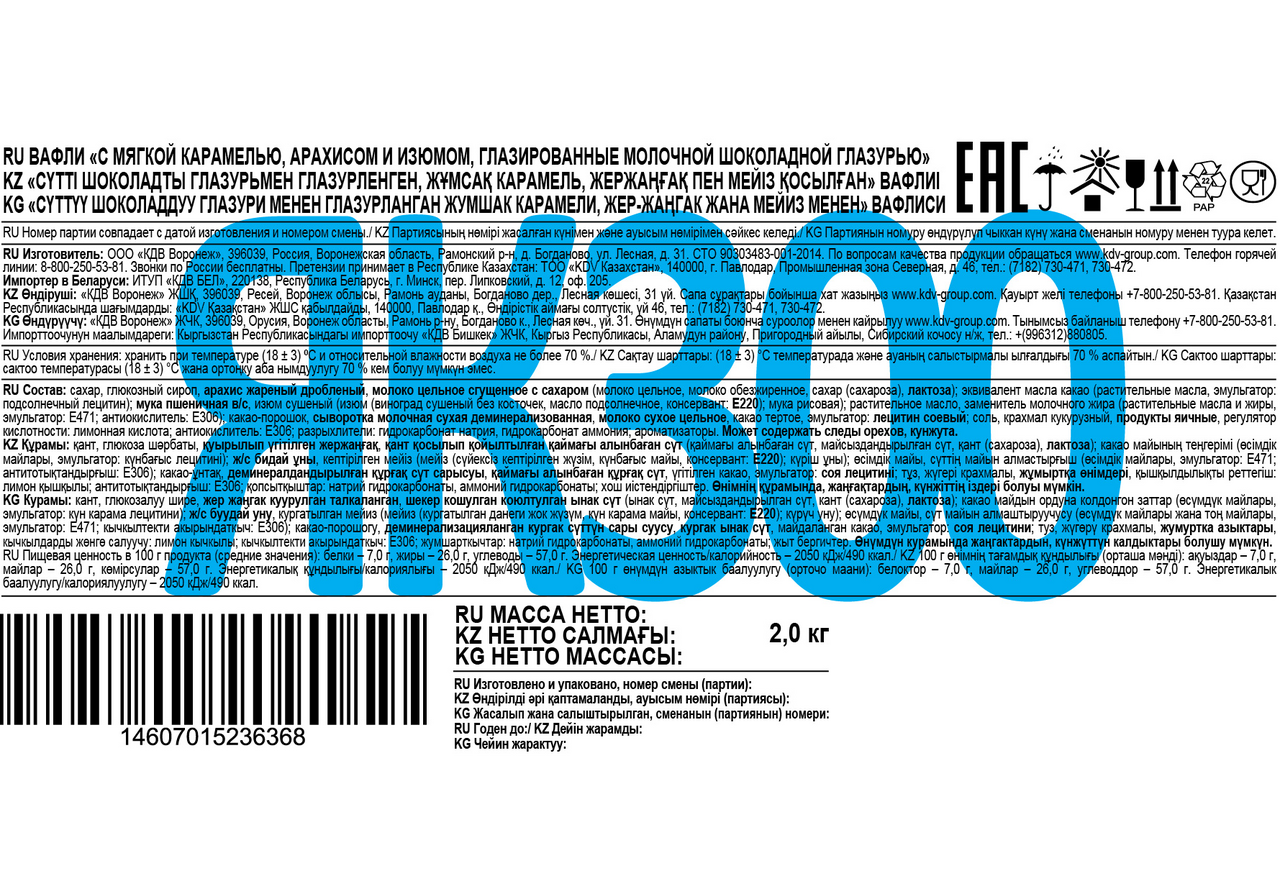 Вафли Яшкино глазированные с мягкой карамелью, арахисом и изюмом, 2кг