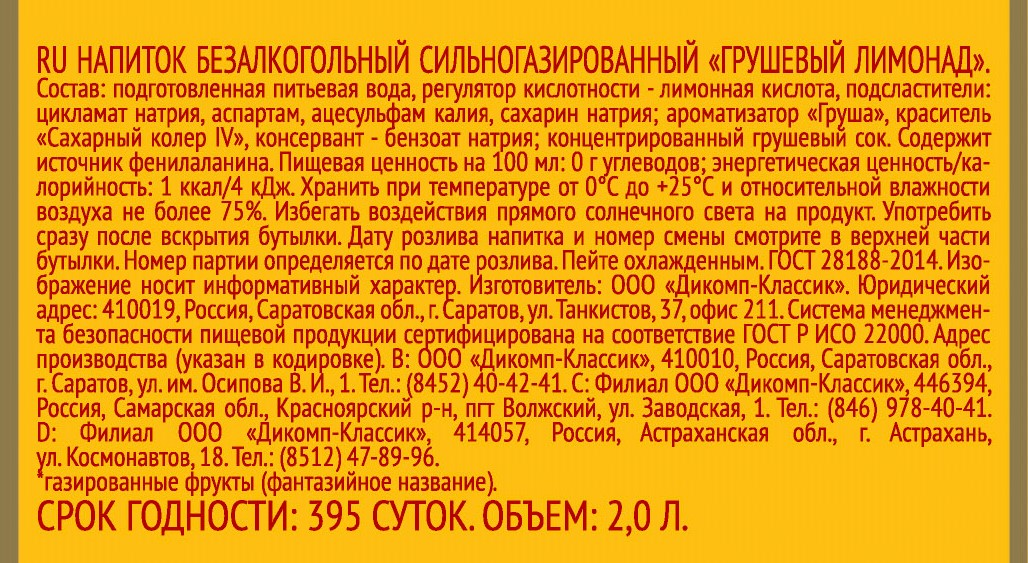 Подготовленная питьевая вода, регулятор кислотности - лимонная кислота, цикламат натрия, аспартам, ацесульфам калия, сахаринат натрия, ароматизатор груша, краситель сахарный колер 4, консервант - бензоат натрия.