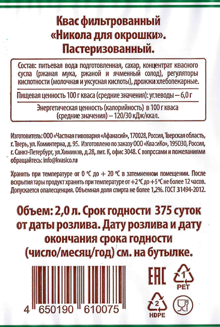Квас Никола для окрошки, 2л - натуральный квас живого брожения. В его состав входят исключительно натуральные ингредиенты: хлебопекарные дрожжи, ячменный и ржаной солод, сахар, очищенная вода. Традиционная технология производства и натуральное сырье - все это обеспечивает замечательные потребительские качества напитка, его способностью утолять жажду, целебные и тонизирующие свойства. Квас Никола; обладает и целебными свойствами, т. к. препятствует развитию болезнетворных микроорганизмов, что объясняется наличием в нем молочной кислоты, витаминов, аминокислот, сахаров и микроэлементов. Непревзойденный вкус кваса Никола позволяют даже самому требовательному потребителю выбрать свой любимый вкус кваса Никола.