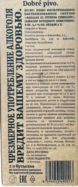 Чешское пиво холодного охмеления (сухого охмеления) с высокой плотностью, которое сварено классическим способом. При изготовлении пива холодного охмеления хмель добавляется не только в процессе варки, но и в процессе брожения и дображивания. Пиво Bakalar Za Studena Chmeleny дображивает в подвалах пивоварни в горизонтальных чанах с добавлением сушеного хмеля. Пиво демонстрирует полный, богатый вкус с медово-карамельной сладостью и травянистой горечью благородного хмеля. Оно отлично утолит жажду и освежит жарким летним днем.