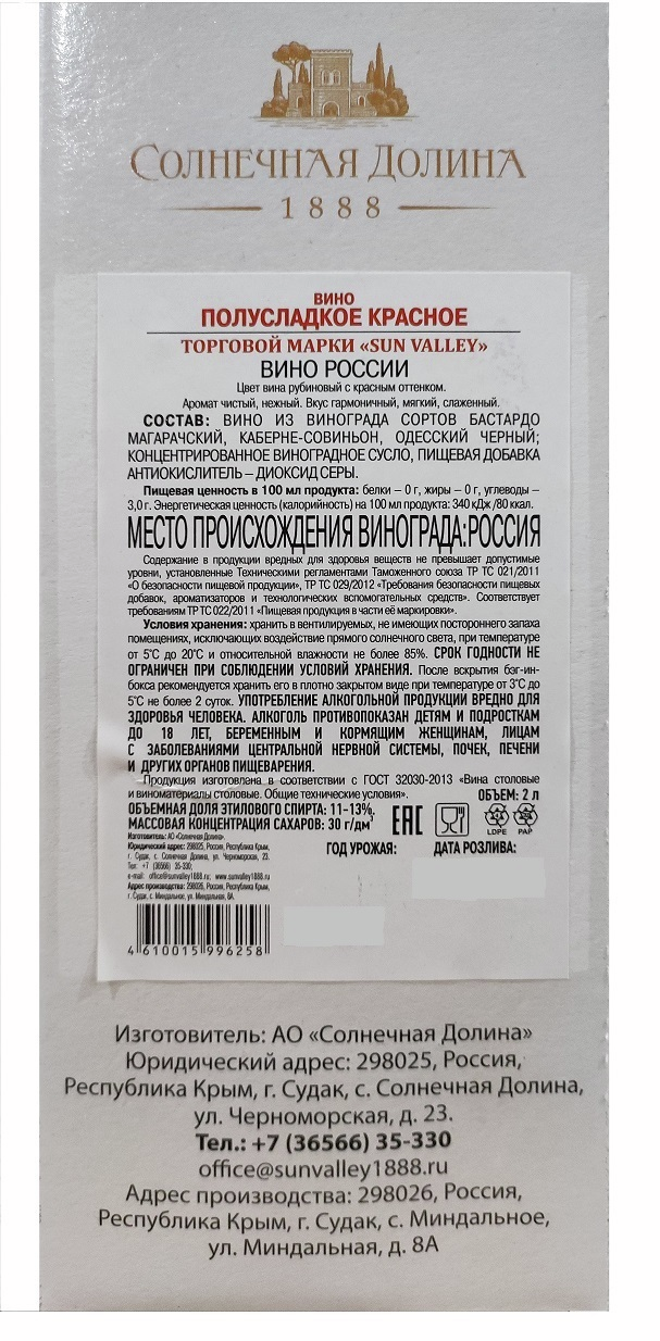 Вино Солнечная Долина красное полусладкое, 2л