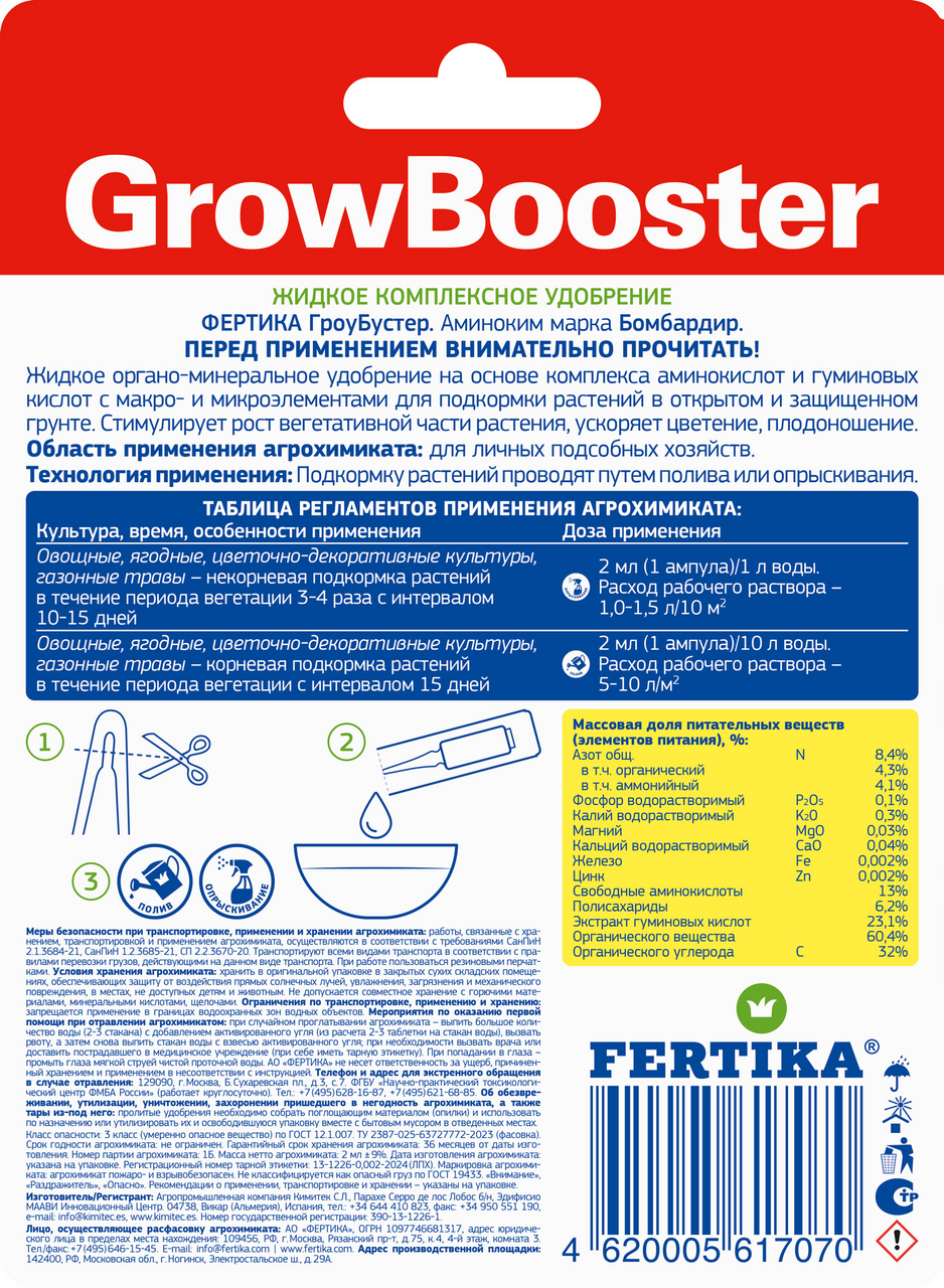 Это универсальный̆, эффективный̆ биостимулятор полного спектра действия, который̆ снижает стресс и повышает продуктивность за счет улучшения энергетического баланса. Кроме того, усиливает действие средств защиты растении. Фертика ГроуБустер создан на основе комплекса аминокислот и гуминовых кислот с каро- и микроэлементами для подкормки растений в открытом и защищенном грунте. Стимулирует рост вегетативной части растения, ускоряет цветение, плодоношение. Технология применения: Подкормку растений проводят путем полива или опрыскивания.