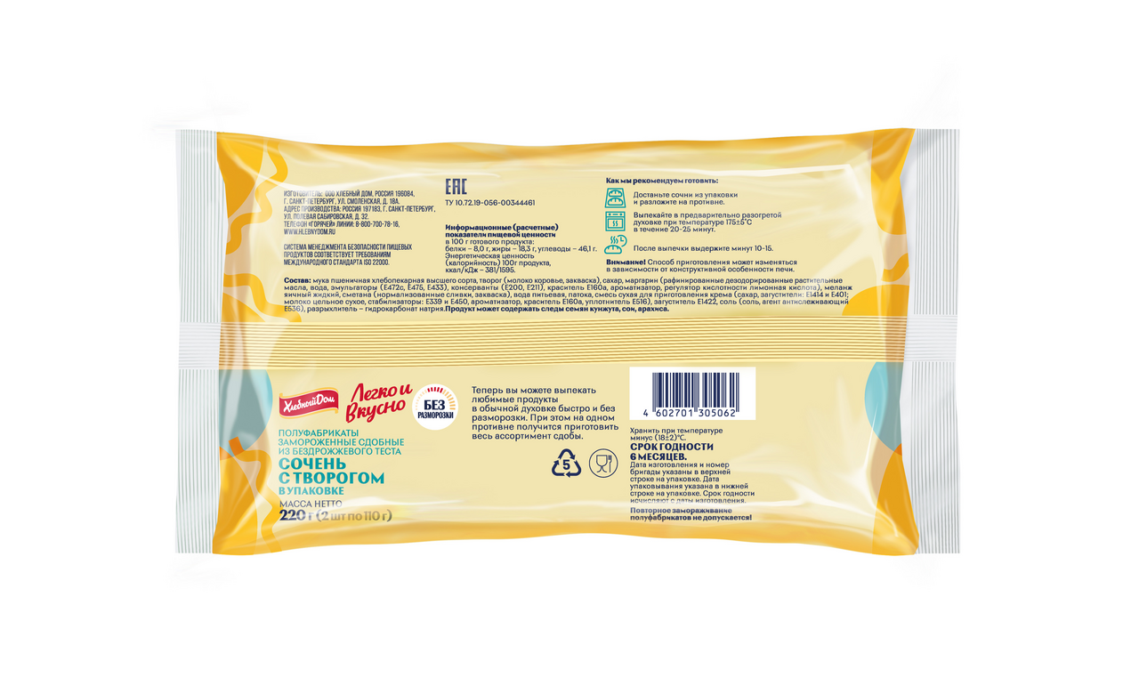 Сочень с творогом имеет рассыпчатое, но влажноватое тесто, однородную, мягкую начинку, без комочков, в меру сладкую. Зубчатые края теста, блестящий бочок и растрескавшаяся, почти рустикальная поверхность Сочня делают это лакомство еще и очень нарядным. Под брендом Хлебный Дом выпускаются: слоеное дрожжевое и бездрожжевое тесто, хлеб и хлебобулочные изделия.