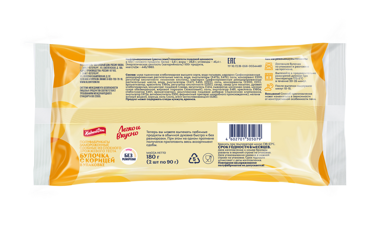 Мука пшеничная хлебопекарная высшего сорта, вода питьевая, маргарин (рафинированные дезодорированные растительные масла, вода, эмульгаторы (Е472c, Е475), соль, консервант Е200, регулятор кислотности лимонная кислота), маргарин (рафинированные дезодорированные растительные масла, вода, эмульгаторы (Е471, Е433, Е322), соль, консерванты (Е200, Е211), ароматизатор, краситель Е160а, регулятор кислотности Е330), сахар, сахар для посыпки, дрожжи хлебопекарные, концентрат пищевой (сахар, загуститель Е1414, сыворотка молочная сухая, молоко сухое обезжиренное, жировой порошок (кокосовый), соль, эмульгатор Е481, краситель Е160а, стабилизатор Е401, ароматизатор), комплексная пищевая добавка (пшеничная клейковина, эмульгатор Е472е, антиокислитель Е300, ферментный препарат микробного происхождения), меланж яичный жидкий, корица, соль (соль, агент антислеживающий Е536).