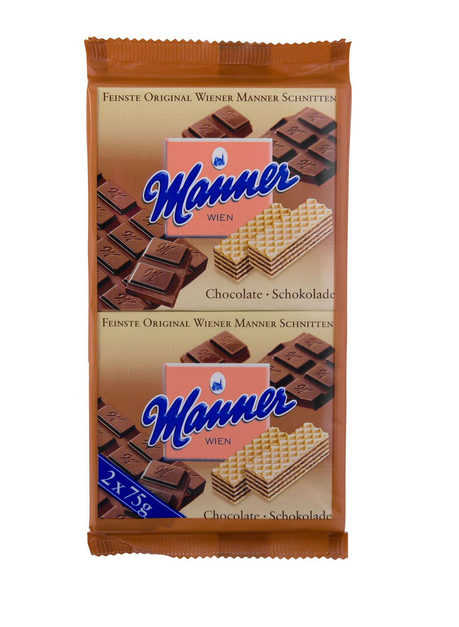 Вафли с шоколадным кремом Manner, 2 х 75 г. Состав: сахар, мука пшеничная, жир специального назначения (растительный), какао-порошок, сухое цельное молоко, масло подсолнечное, яичный порошок, эмульгатор Е322, соль поваренная, разрыхлитель сода пищевая, ароматизатор идентичный натуральному - 'Ванильный', регулятор кислотности - кислота лимонная. Противопоказано при индивидуальной непереносимости белка молока или яичному белку. Пищевая ценность в 100 г: белки 5 г, жиры 28 г, углеводы 63,1 г. Энергетическая ценность: 507 ккал. Хранить в сухом прохладном месте при температуре от +15 до +21'C и относительной влажности воздуха не более 70%. Не подвергать воздействию прямого солнечного света. Срок годности: 12 месяцев.