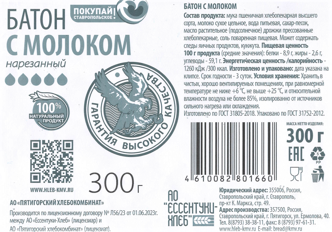 Батон Ессентуки-Хлеб с молоком, 300г