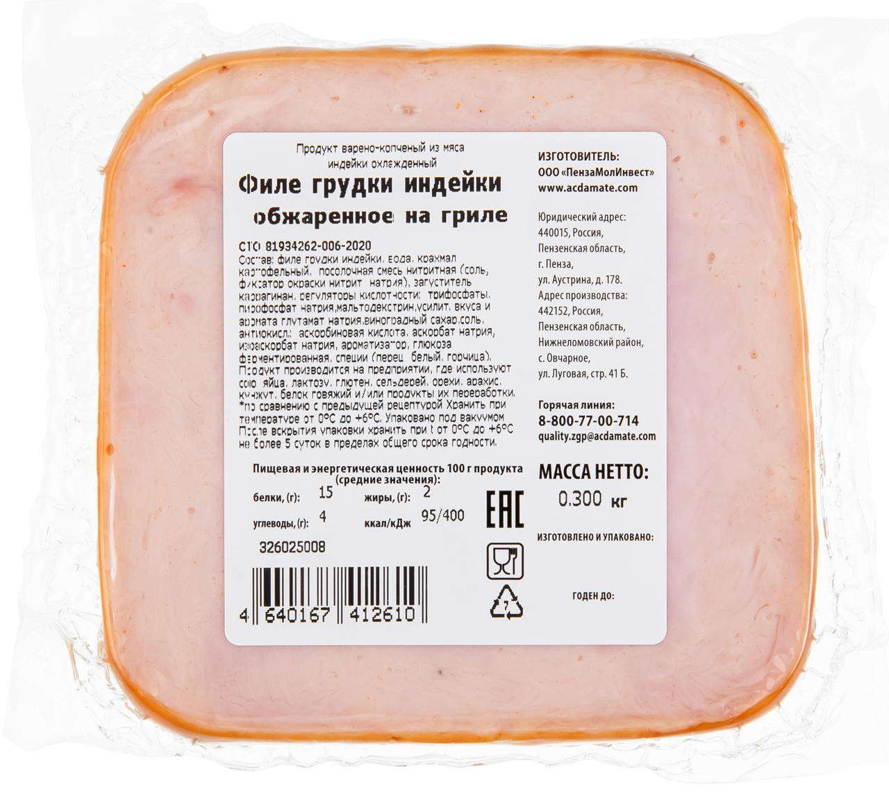 Филе грудки индейки, вода, крахмал картофельный, посолочная смесь нитритная (соль, фиксатор окраски нитрит натрия), загуститель каррагинан, регуляторы кислотности: трифосфаты, пирофосфат натрия, мальтодекстрин, усилитель вкуса и аромата глутамат натрия 1-замещенный, виноградный сахар, соль, антиокислитель аскорбат натрия, ароматизатор, глюкоза ферментированная, специи (перец белый, горчица).